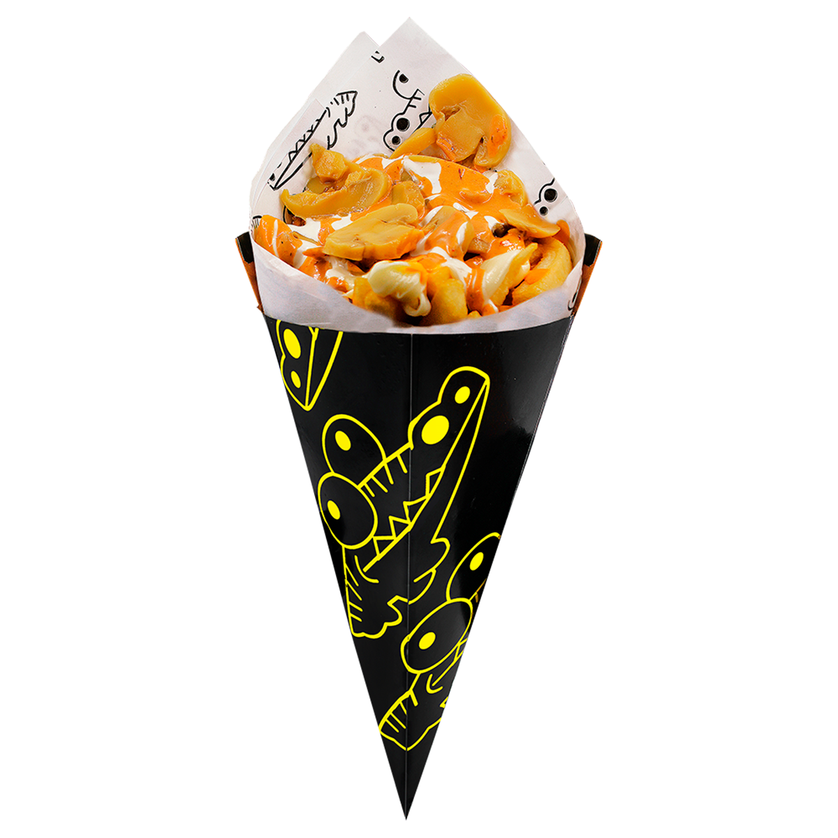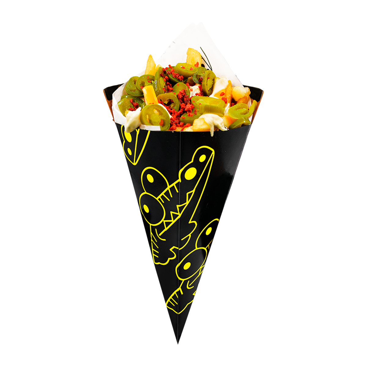 1 Cono fries a elegir guacamole, chicken cruji, bacon, pizza y un refresco a elegir.
