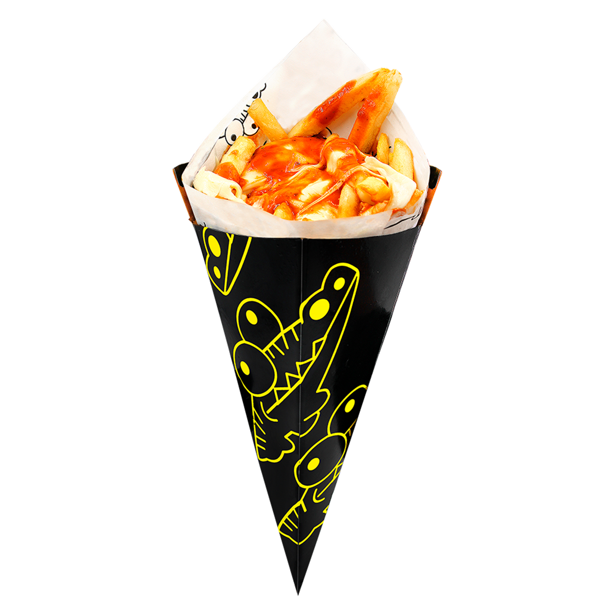 Papas a la francesa con el sazonador a elegir: parmesano ranchero, limón, house, en presentación cono y acompañadas de salsa cátsup.