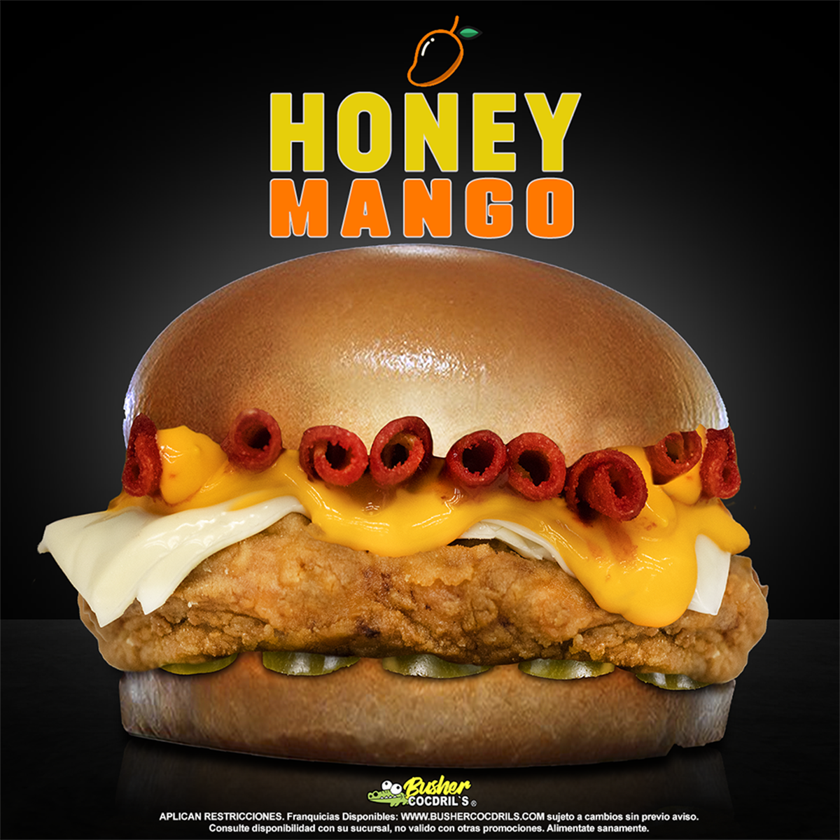 Deliciosa hamburguesa a base de pechuga de pollo 150 g, acompañada de salsa sweet mango habanero, Takis fuego, cheesse dip en espiral, queso manchego y jalapeño en rodajas.
