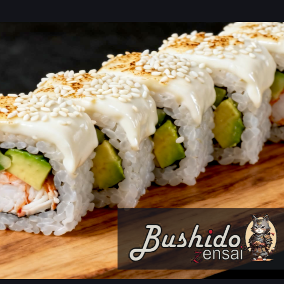 Por dentro: Alga, Pepino, Aguacate y Surimi; Por fuera: Queso Philadelphia con Empanizado crocante y Ajonjoli blanco tostado con una soyera de salsa dulce de anguila .