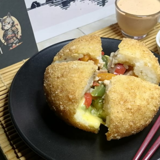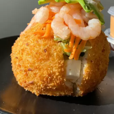 Bola de arroz empanizada crocante Rellena de alambre de pollo, tocino pimientos, aguacate, queso gouda derretido. con su salsa de chipotle de la casa
