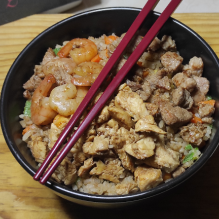 Arroz frito con verduras: Zanahoria, Calabaza, Pollo, Arrachera y Camarón Con una soyera de soya con chiles toreados