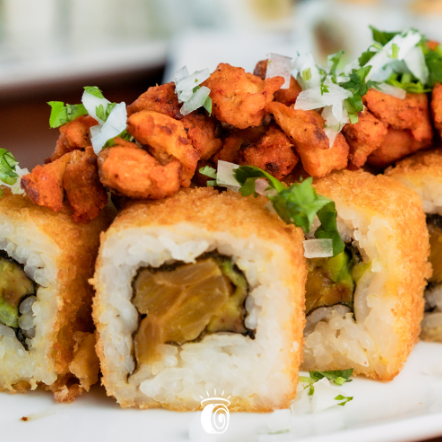 SUSHI AL PASTOR delicioso sushi empanizado relleno de piña aguacate carne al pastor con manchego derretido empanizado frito con su salsa de soya con chiles toreados y limon