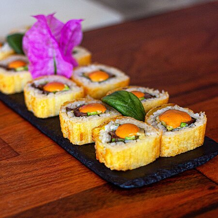 Por dentro: Alga, Queso Crema, Pepino, Surimi y Aguacate . Por fuera: Empanizado crocante y Ajonjoli blanco tostado con una soyera de chiles toreados con soya .