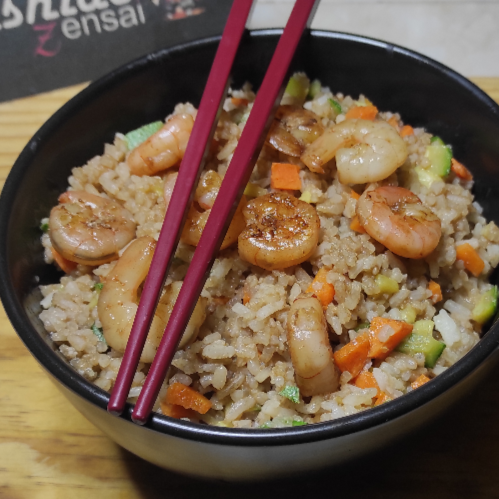 Arroz Frito con Verduras, Zanahoria, Calabaza, Cebolla y Camaron Zasonado con Matequilla con una Soyera de Soya con Chiles Toreados