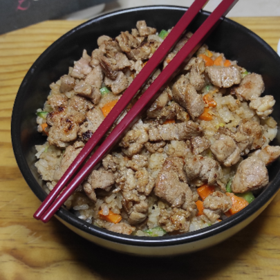 Arroz Frito con Verduras, Zanahoria, Calabaza, Cebolla y Pollo Frito con una Soyera de Soya con Chiles Toreados