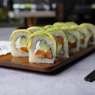 Por dentro: Alga, Pepino, Queso Crema y Salmon Fresco. Por fuera: Láminas de Aguacate Espolvoreado con Ajonjoli Tostado. Con Su Soyera de Salsa de Anguila
