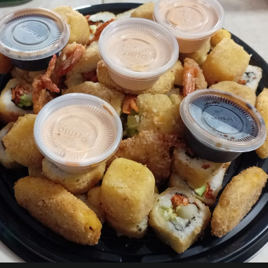 SUSHI PASTOR EMPANIZADO NUEVO !*2 + Kushiage de Platano 6 Pz*1 + Soya con Chiles Toreados*3 + Deliciosos Camarones al Coco Empanizados*1 + Aderezo Chipotle*3 + Bola Zensai de Arrachera*1 + Kushiage de Queso Manchego 6 Pz*1