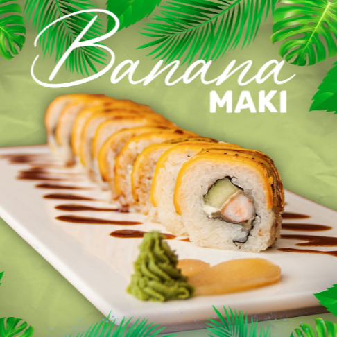 Por dentro: Alga, Queso Filadelfia, Pepino y Aguacate. Por fuera: Plátano Macho Frito con Ajonjoli tostado y una orden de Salsa de Anguila dulce.
