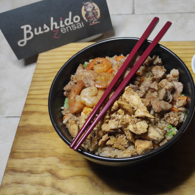 Arroz frito con verduras: Zanahoria, Calabaza, Pollo, Res y Camarón