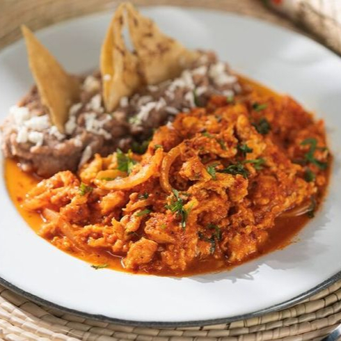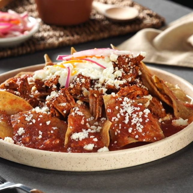 Chilaquiles Colibrí, crujientes totopos en salsa roja o verde, servidos con arrachera jugosa.