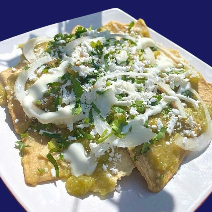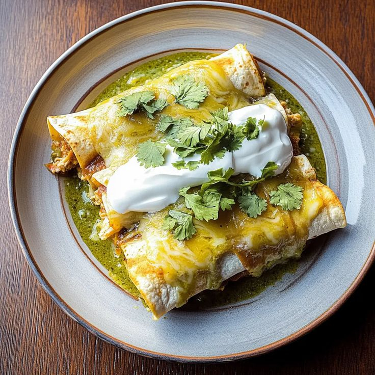 Enchiladas rellenas de pollo, cubiertas con salsa roja o verde, acompañadas de queso y crema.