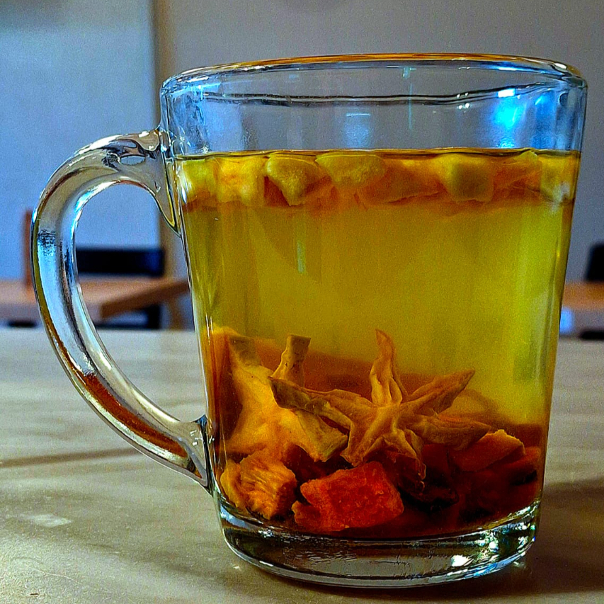 Refrescante bebida de tizanas con fresa y kiwi, ideal para disfrutar en cualquier momento.