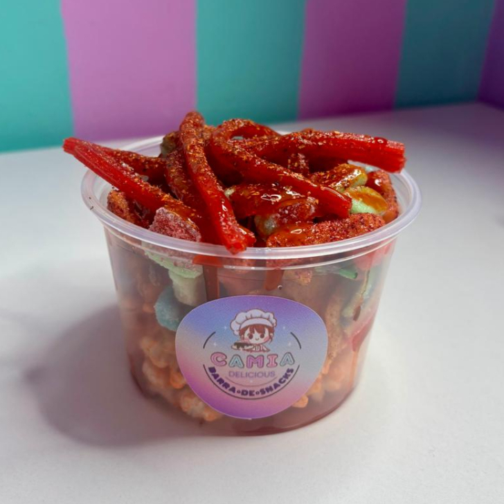 Vaso botanero con pepino, jícama, zanahoria, churritos, cacahuates, gomitas y mucho más.