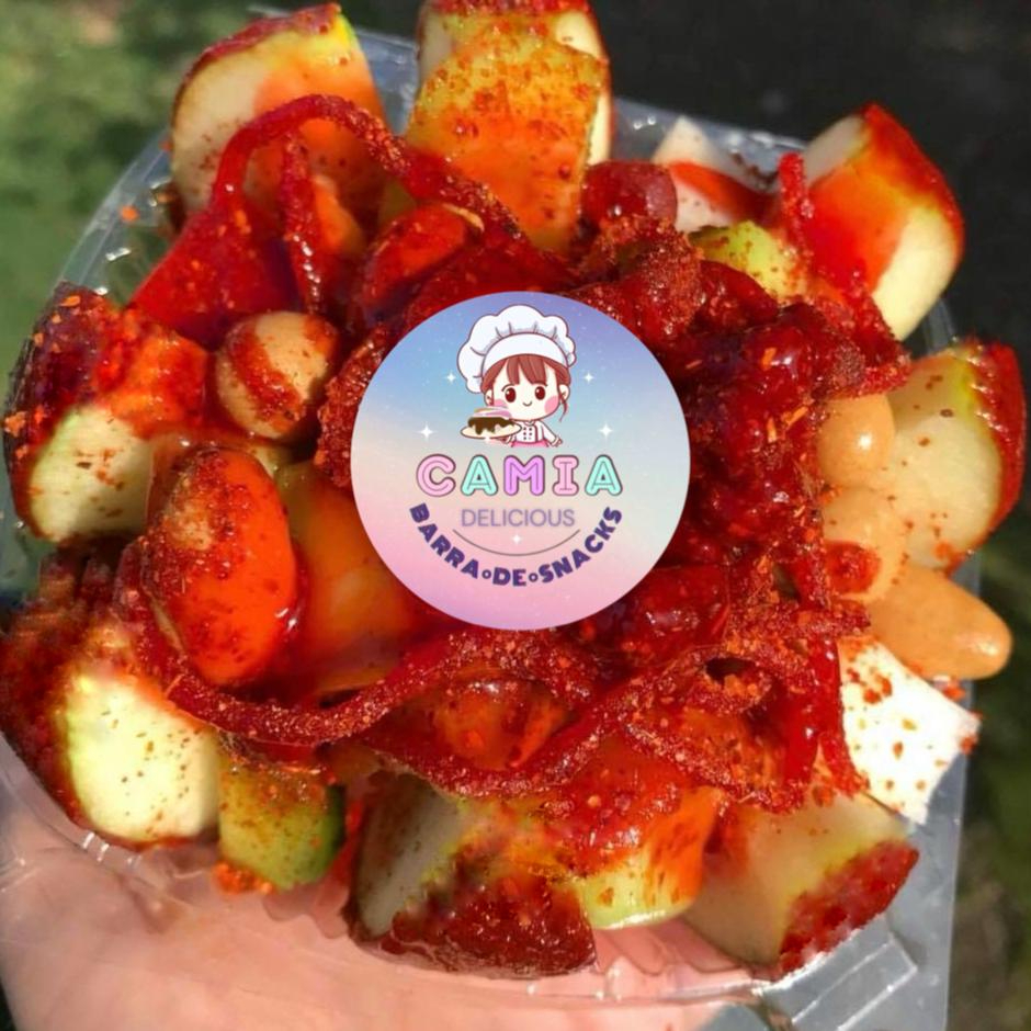 Manzana cubierta de pulpa de tamarindo, tajin, miguelito, chamoy, cacahuates y gomitas.