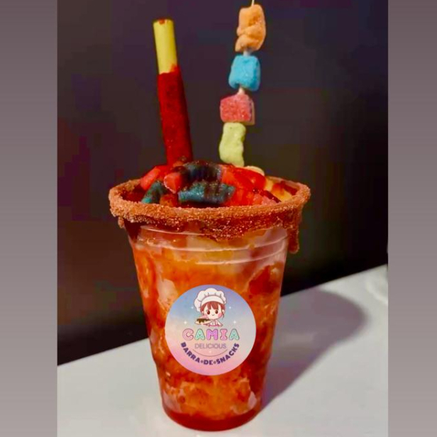 Vaso botanero con pepino, jícama, zanahoria, churritos, cacahuates, gomitas y mucho mas.