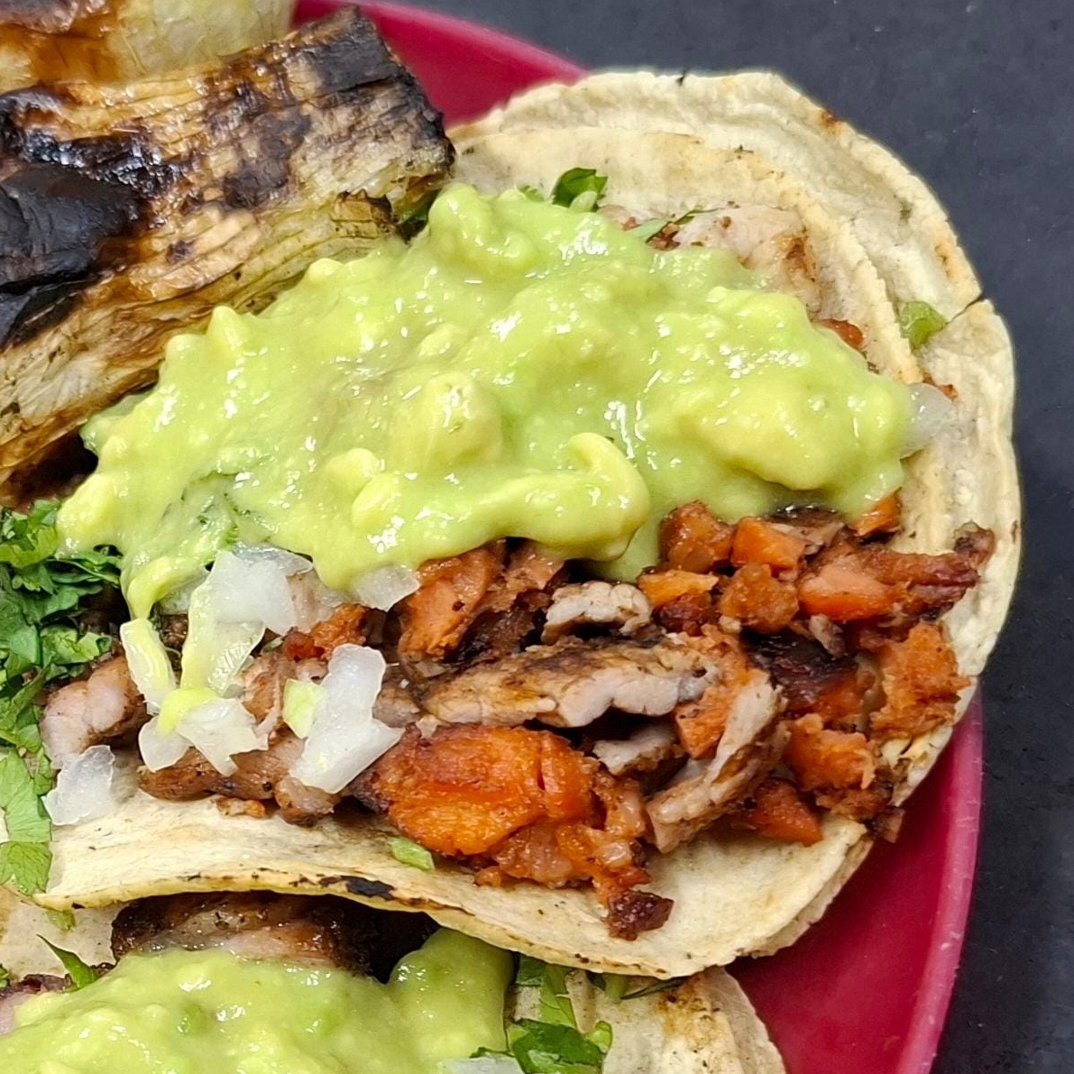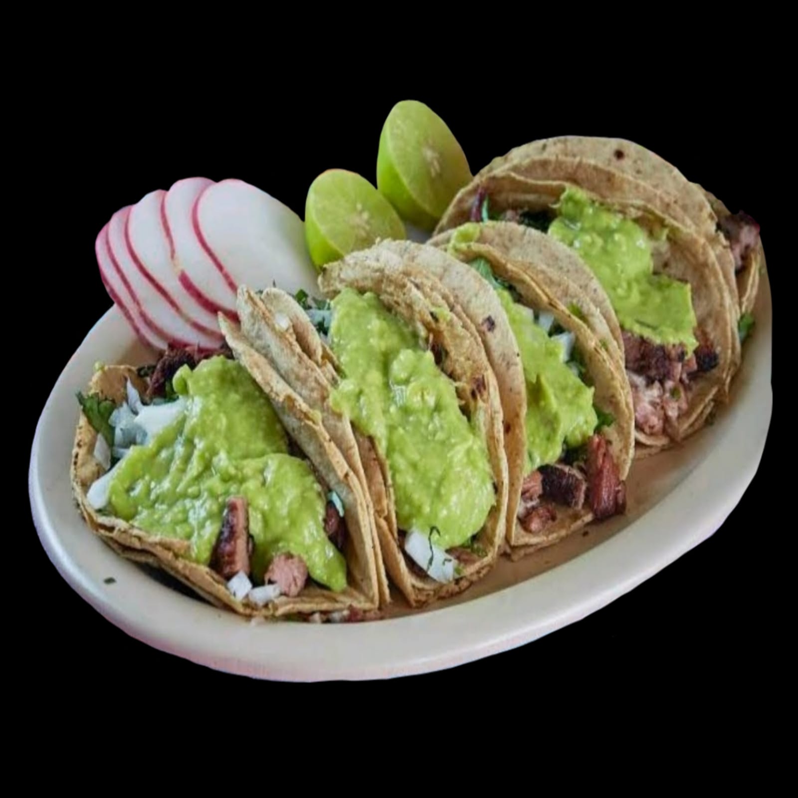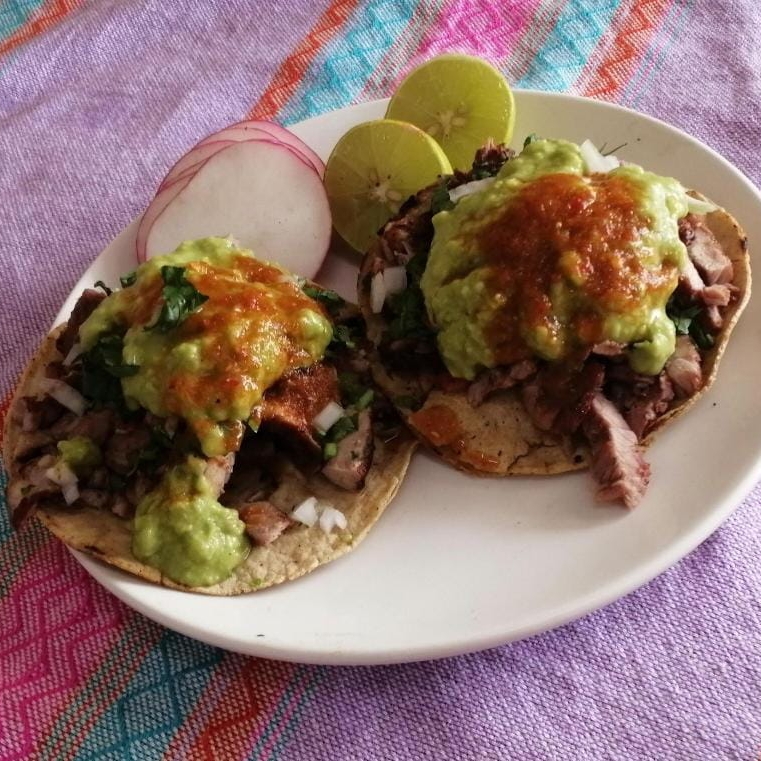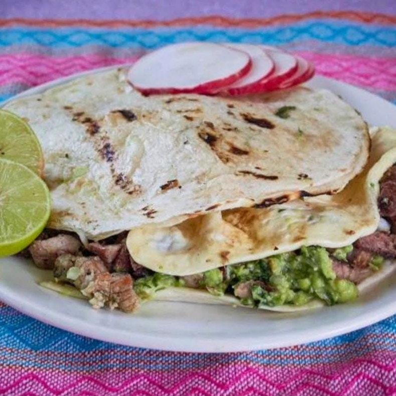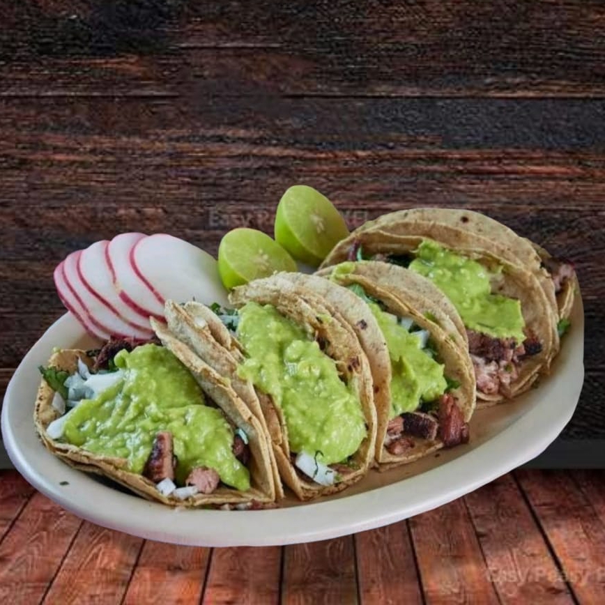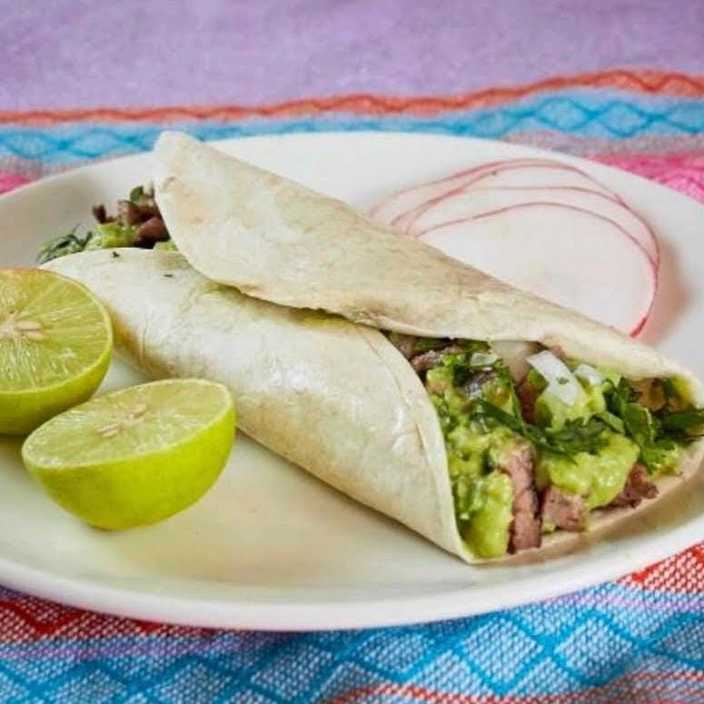 Incluye: Tortillas, guacamole, salsa, cilantro, cebolla, limones.