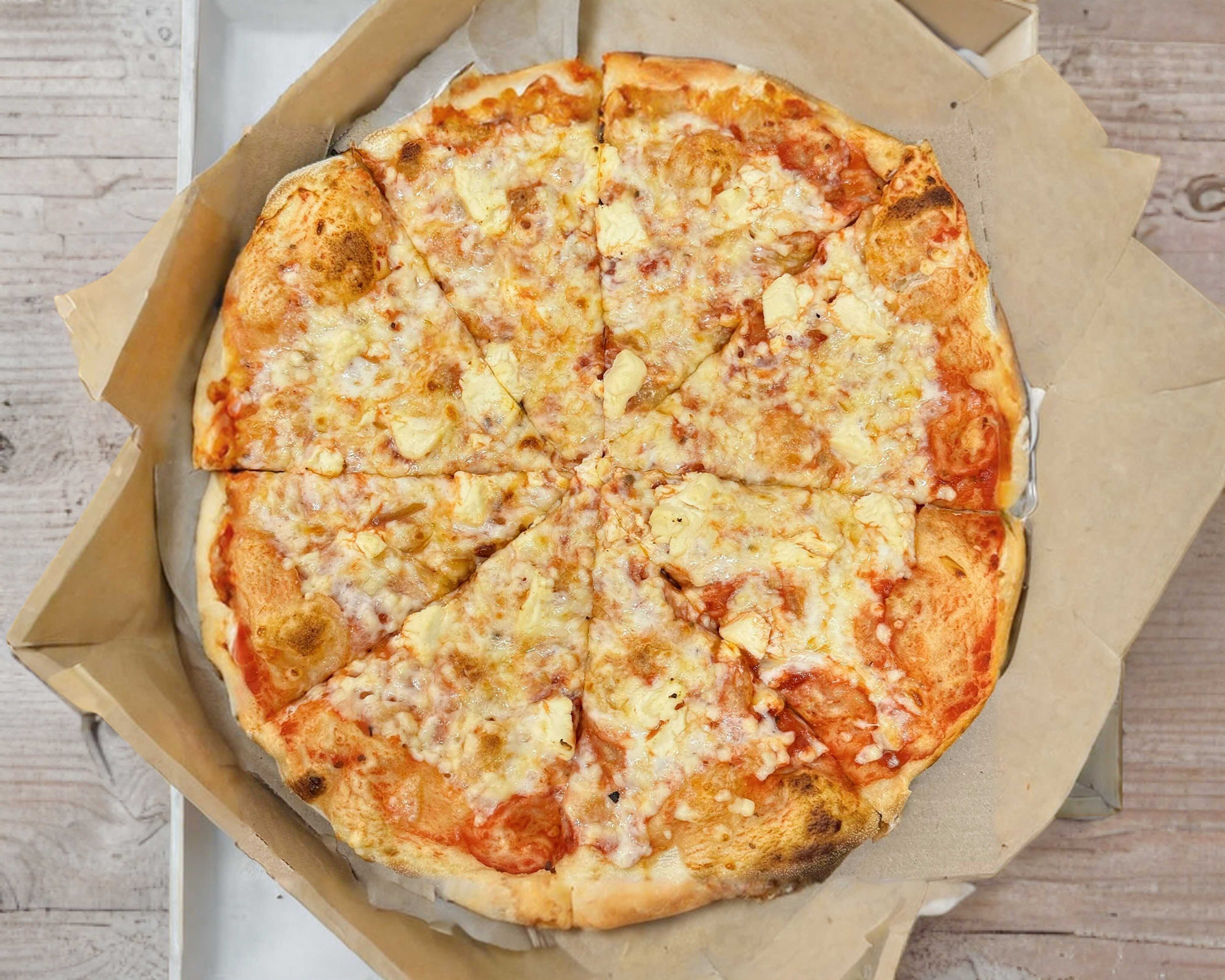 Pizza artesanal, salsa italiana, queso mozzarella Parmesano, provolone y queso crema