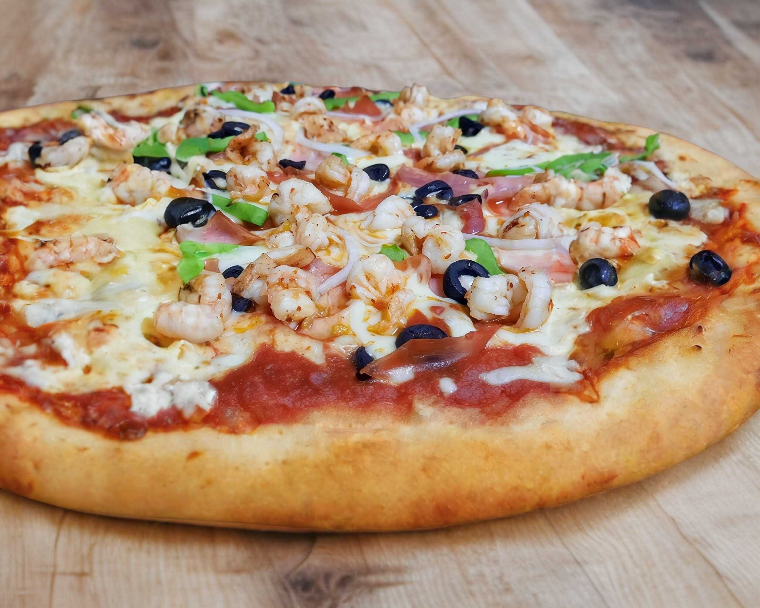 Pizza artesanal con queso mozzarella salsa italiana, camarones, tocino, jamón serrano, olivas y pimiento.