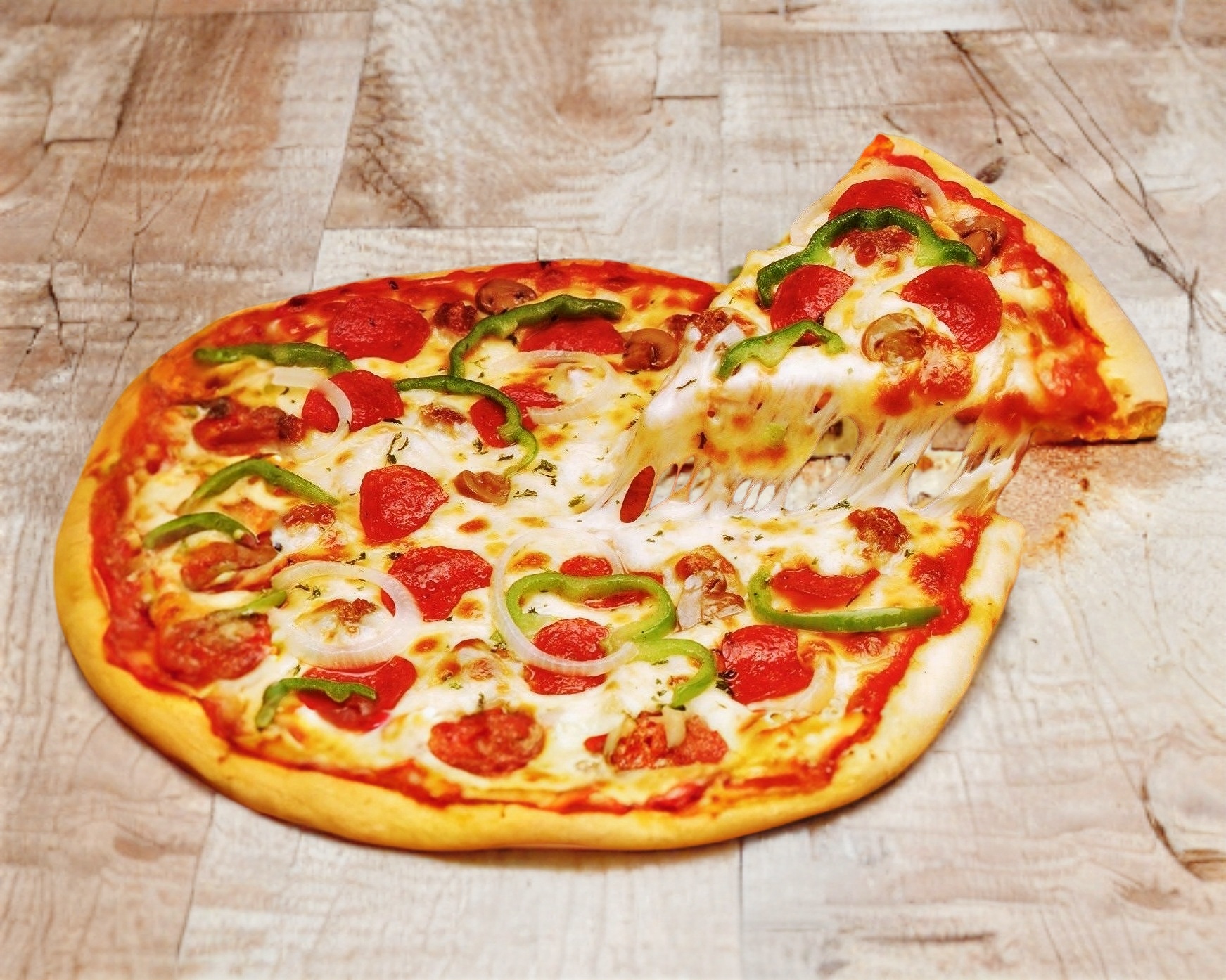 Pizza artesanal hecha en horno de piedra, mozzarella, salsa italiana, pepperoni, pimiento, champiñón y cebolla.