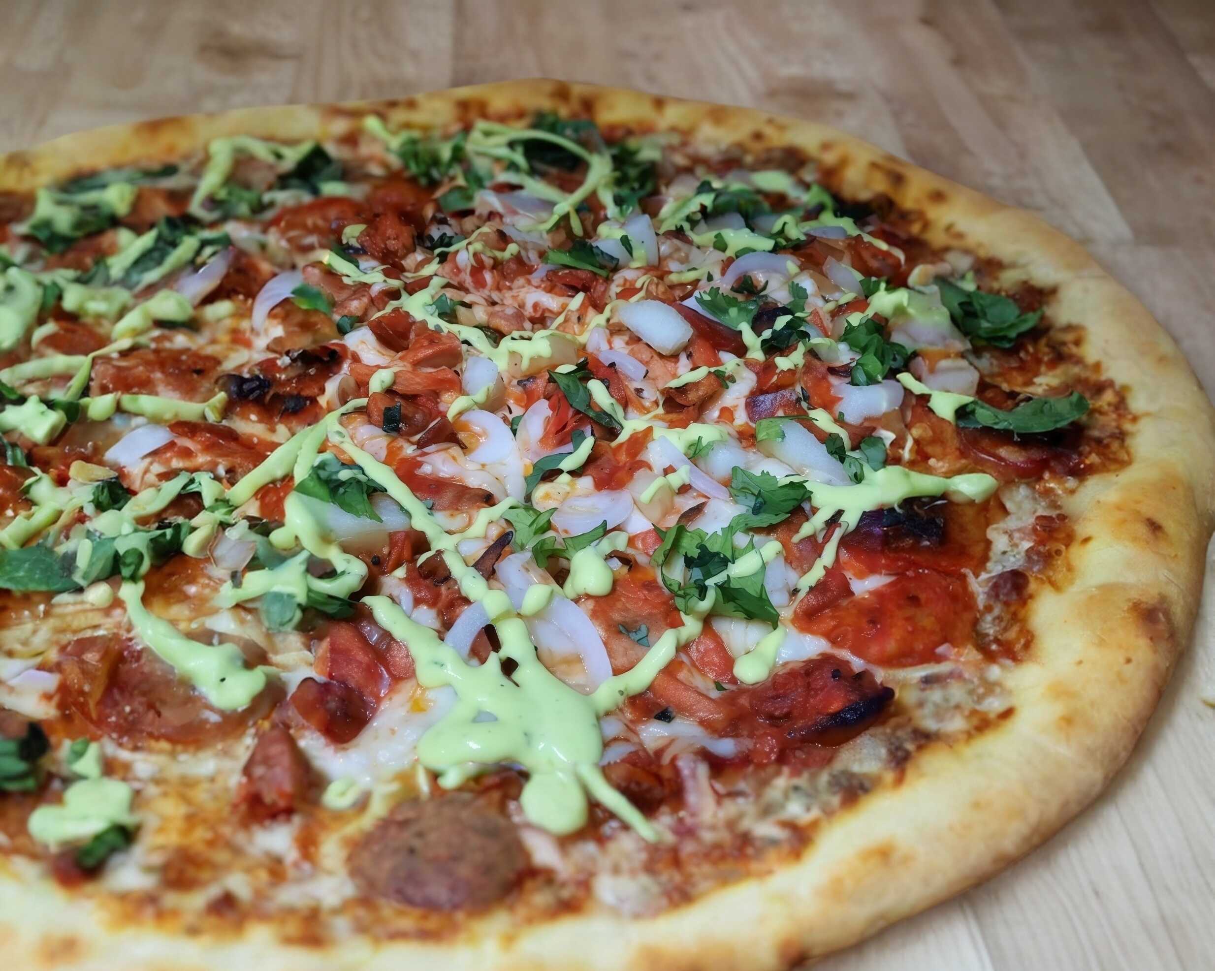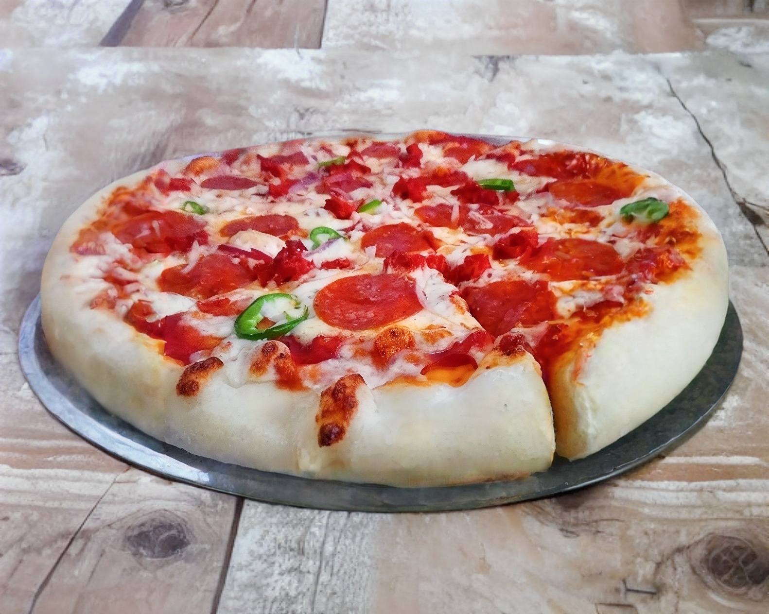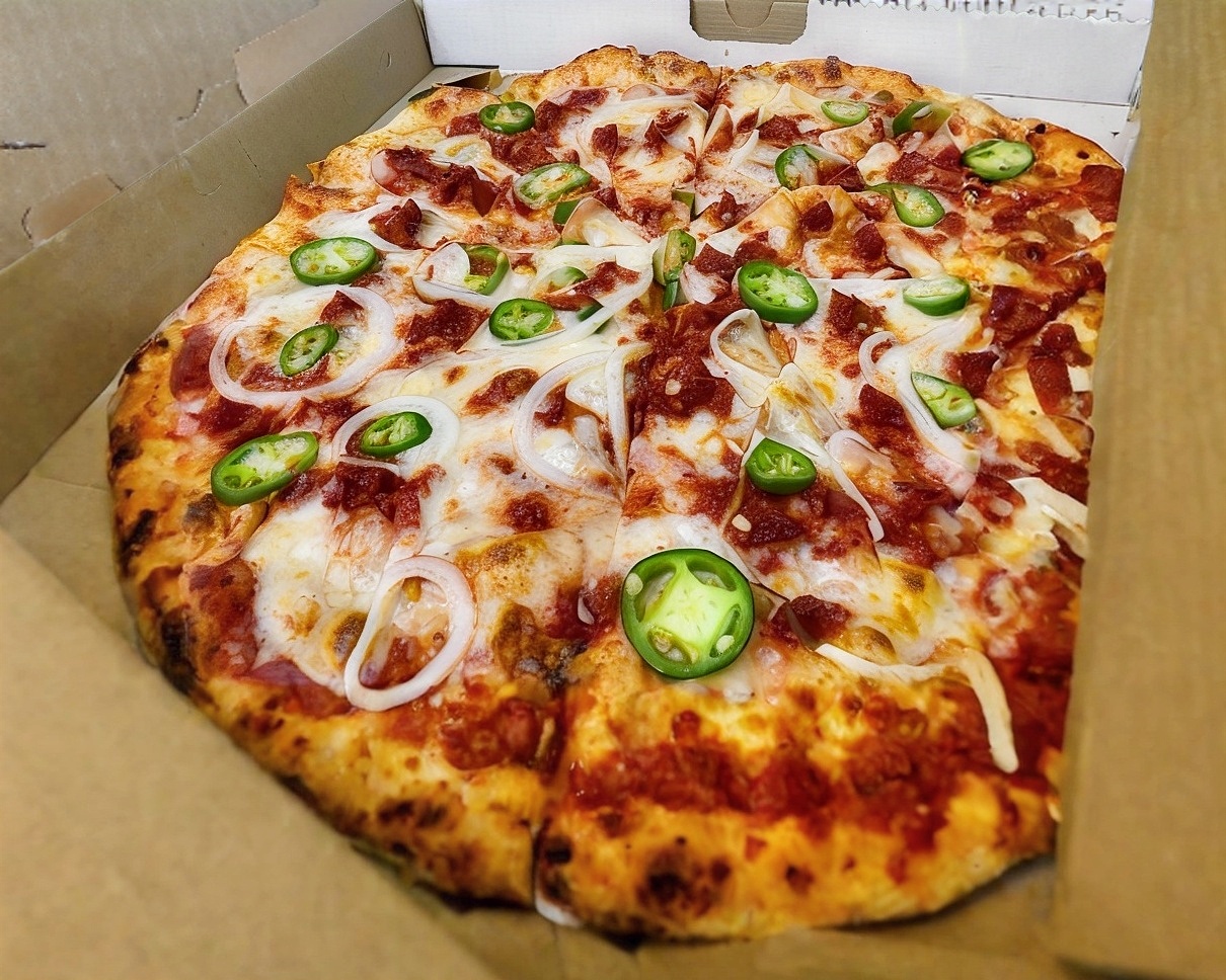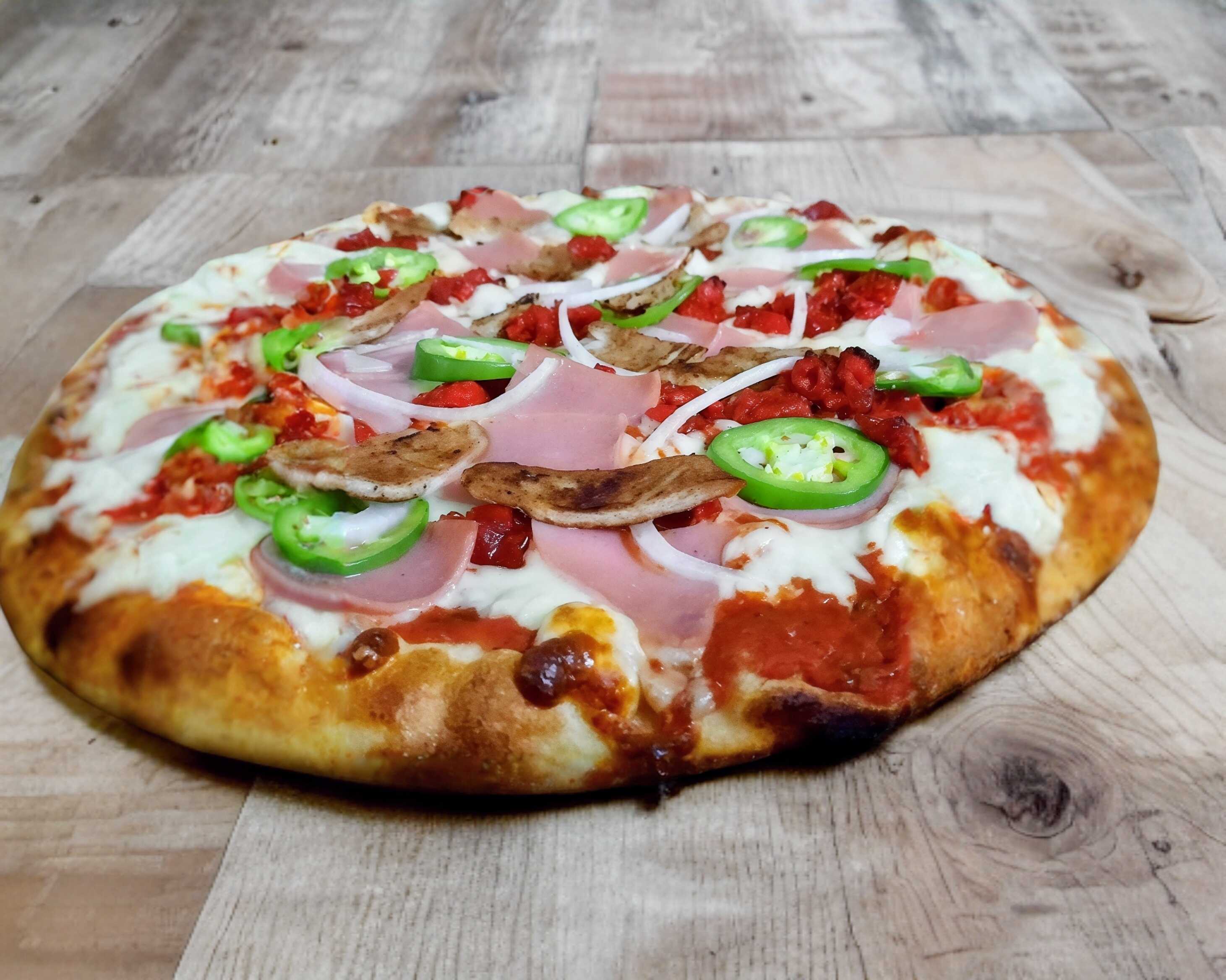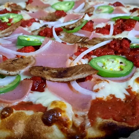 Pizza artesanal hecha en horno de piedra con pepperoni, chorizo, jalapeños y cebolla.