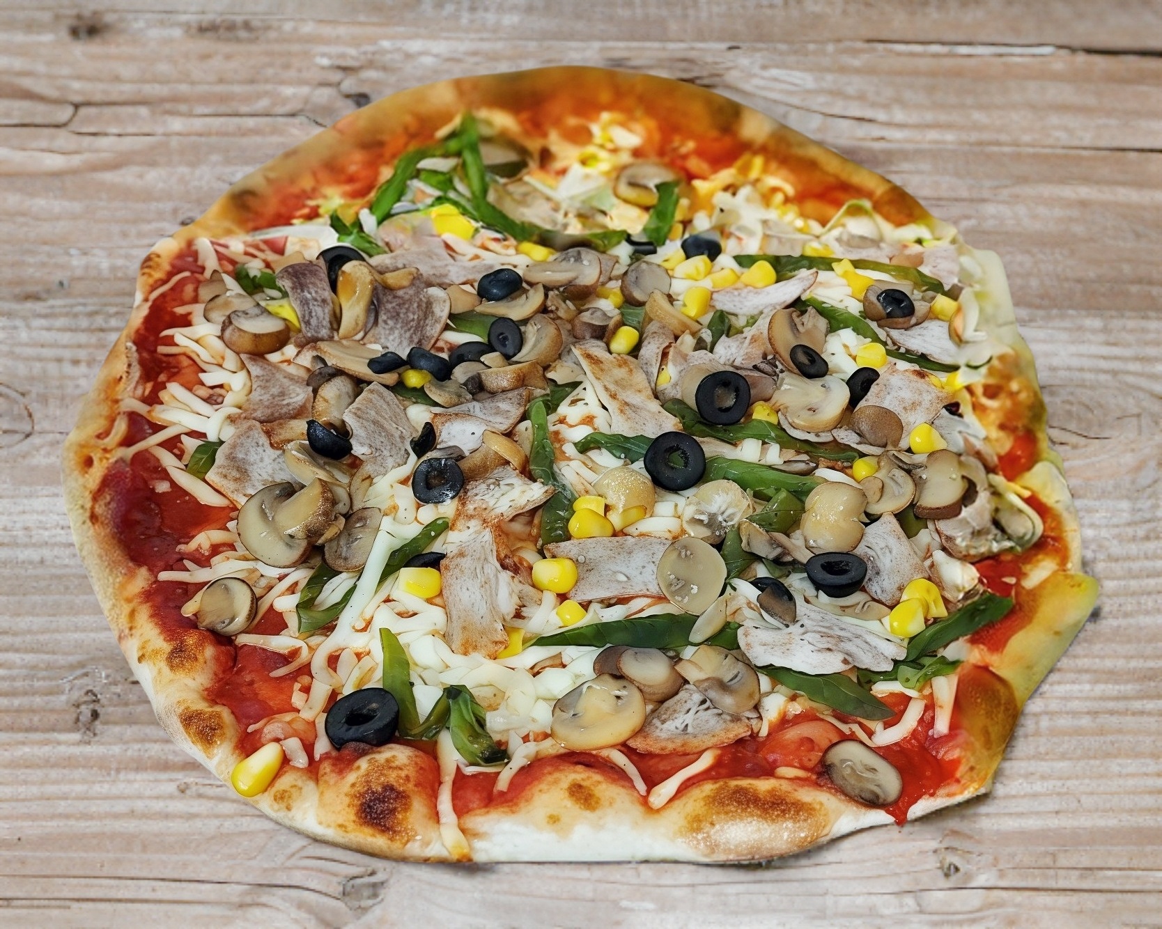 Pizza artesanal hecha en horno de piedra, mozzarella, salsa italiana, pimiento, pollo, champiñón y cebolla.