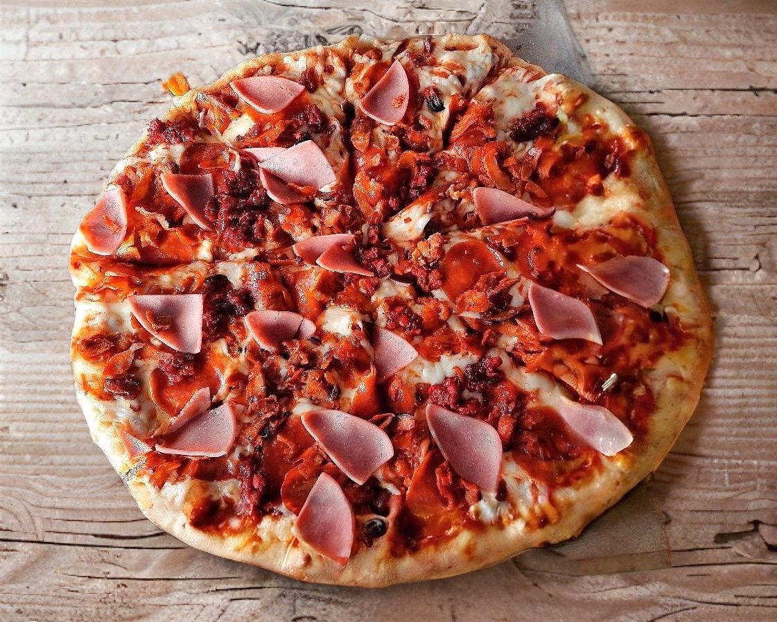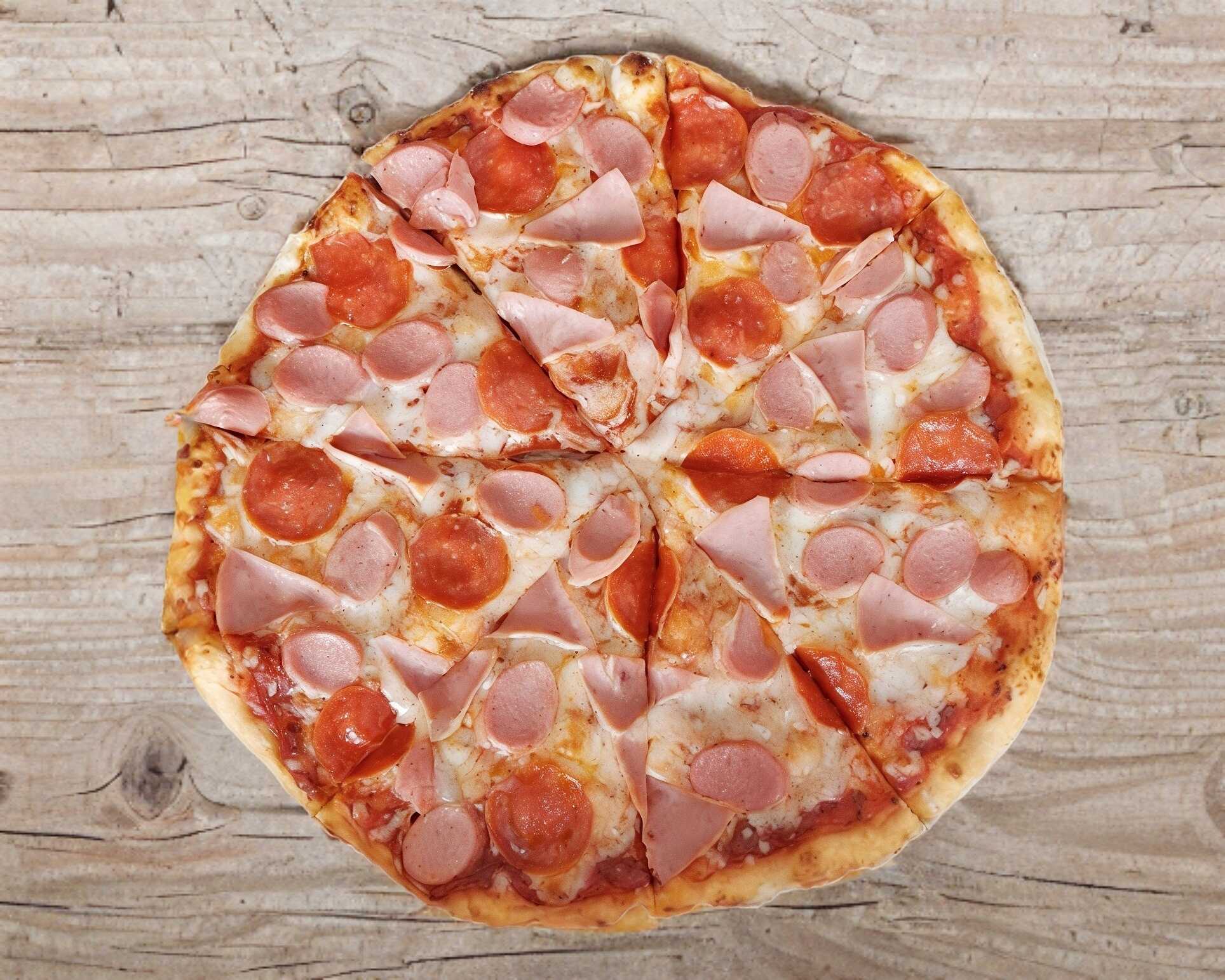 Pizza artesanal, mozzarella salsa italiana, jamón, salchicha y pepperoni.