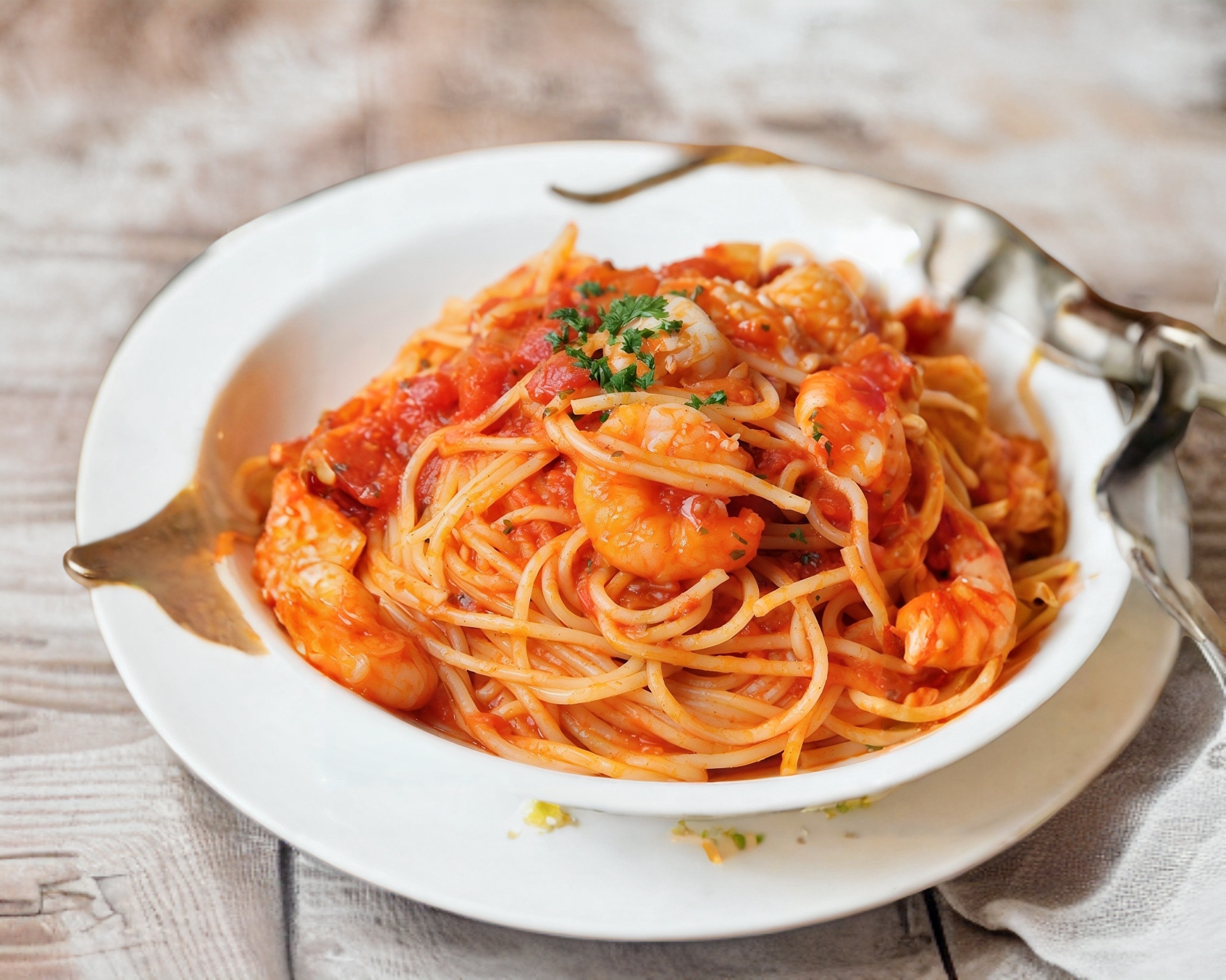 Pasta al dente en salsa de tomate, camarones y queso gratinado