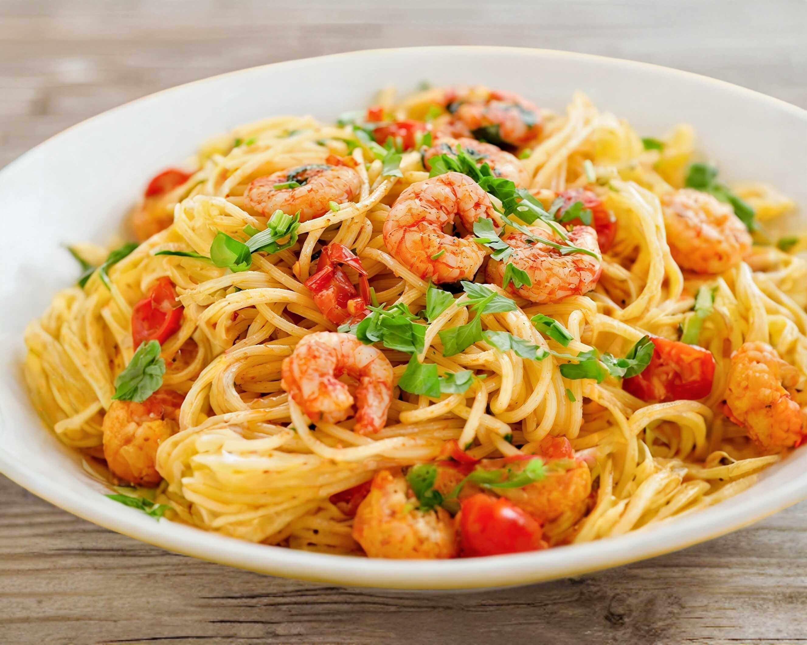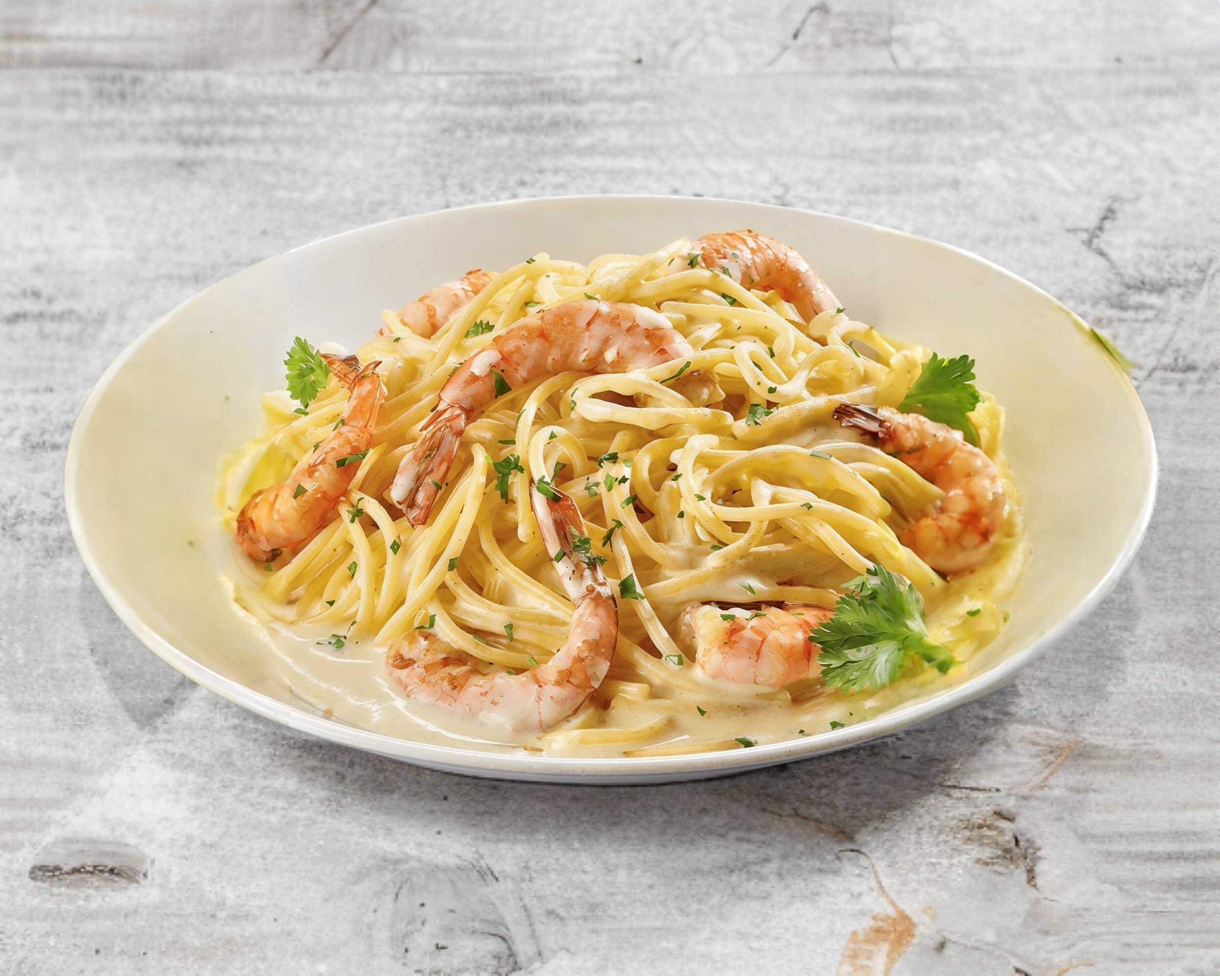 Pasta al dente al ajillo con camarones y un toque de queso parmesano y mozzarella.