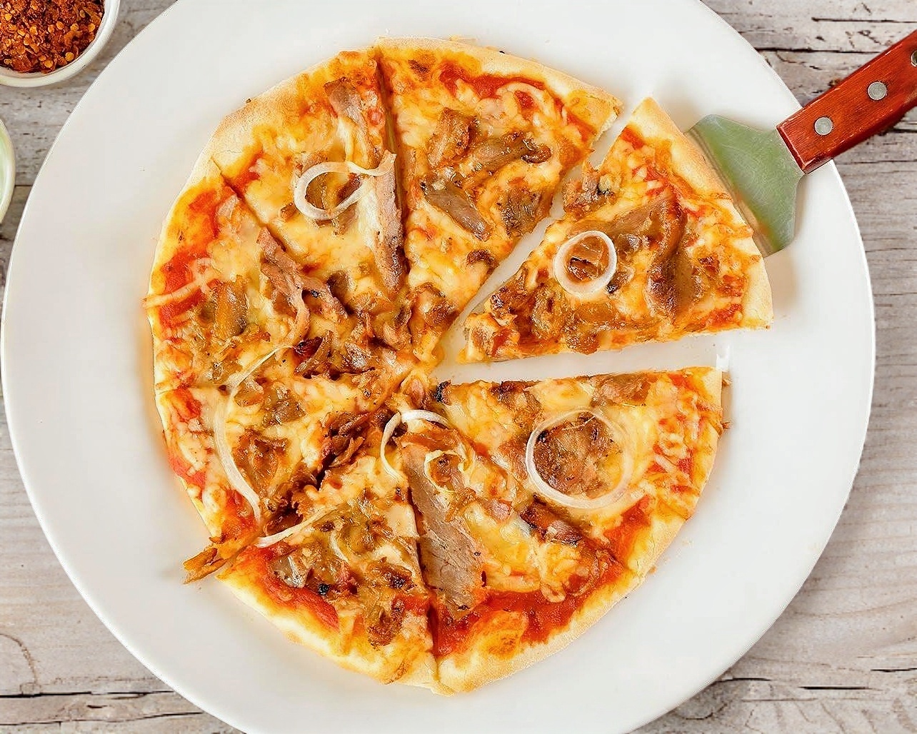 Pizza artesanal hecha en horno de piedra con queso mozzarella, salsa italiana y carne árabe.