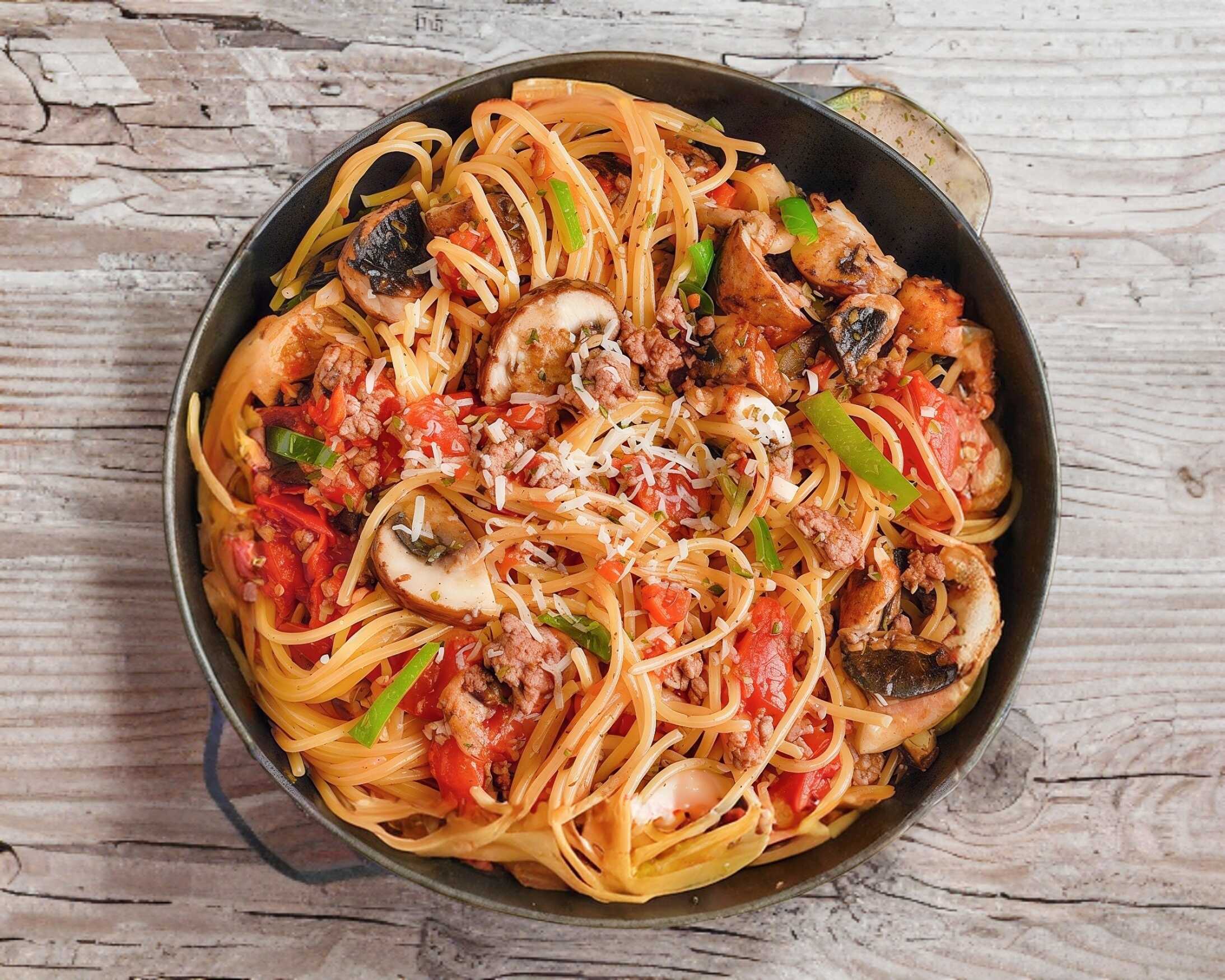 Salsa al pomodoro con un toque picante, tocino, champiñones y parmesano
