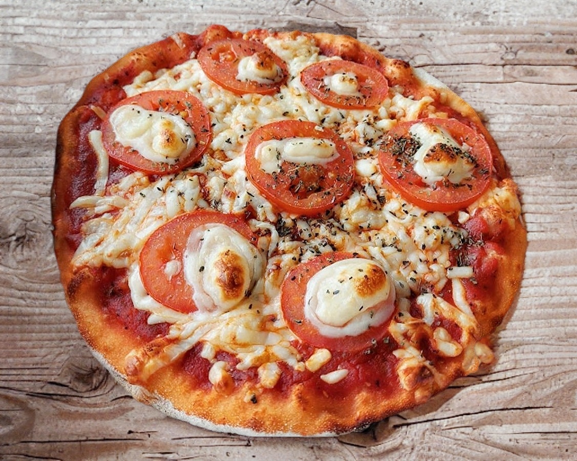 Pizza artesanal con mozzarella salsa italiana, albahaca, y tomate fresco.