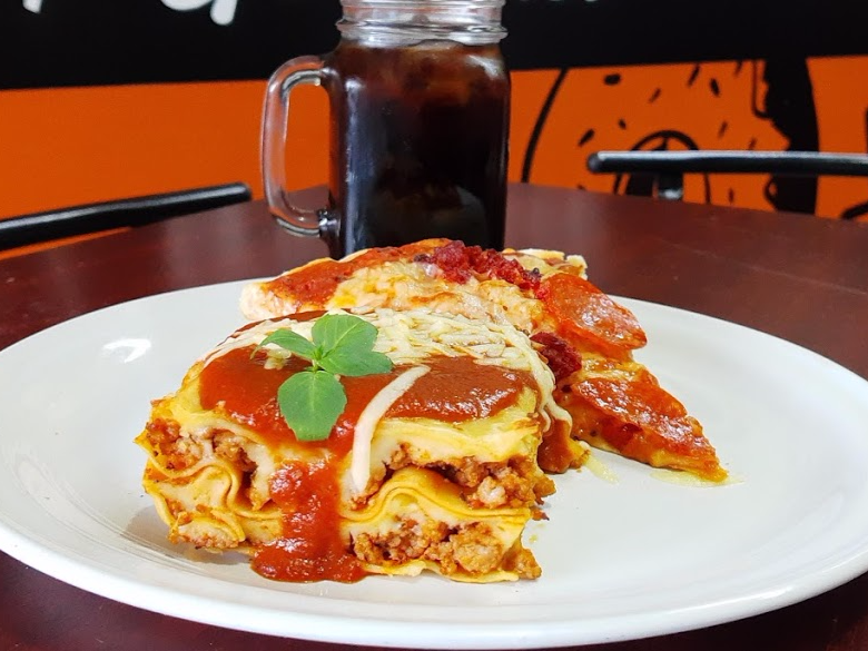 Pasta fresca, con salsa bechamel, pomodoro y carne molida, con queso mozzarella.