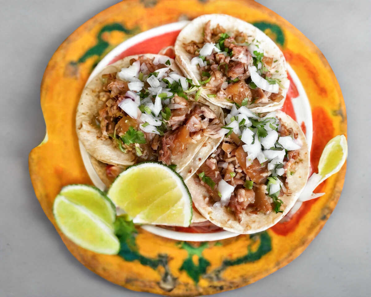 Taco (doble tortilla) de carnitas maciza con verdura y salsa aparte.