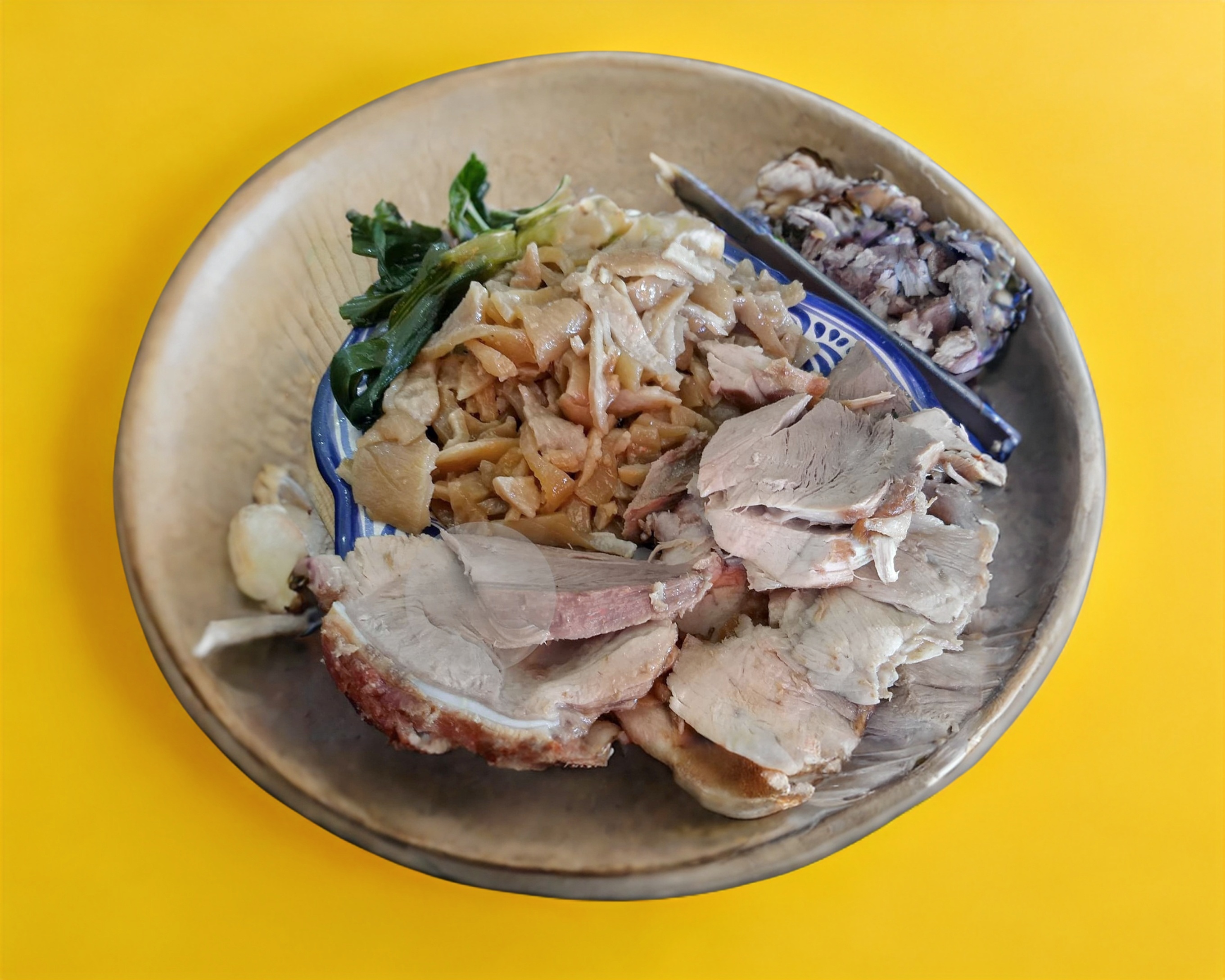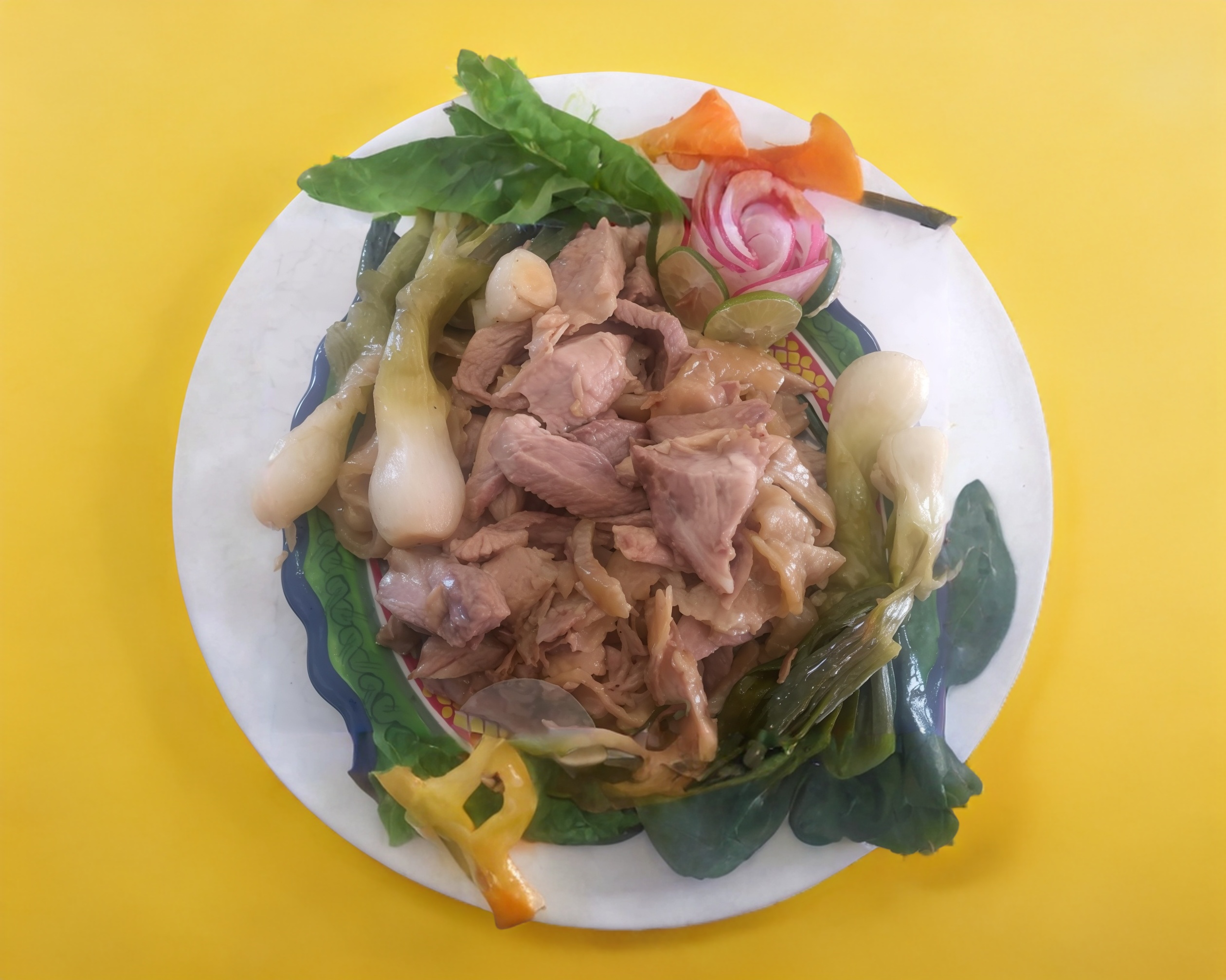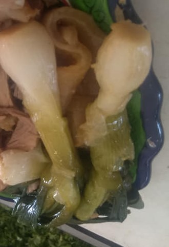 1 kilo de chamorro, salsas, verde, roja, limones, rábanos, cilantro, (el chamorro lleva su hueso incluido) cebolla, una orden de tortillas, y un refresco de 2 litros.