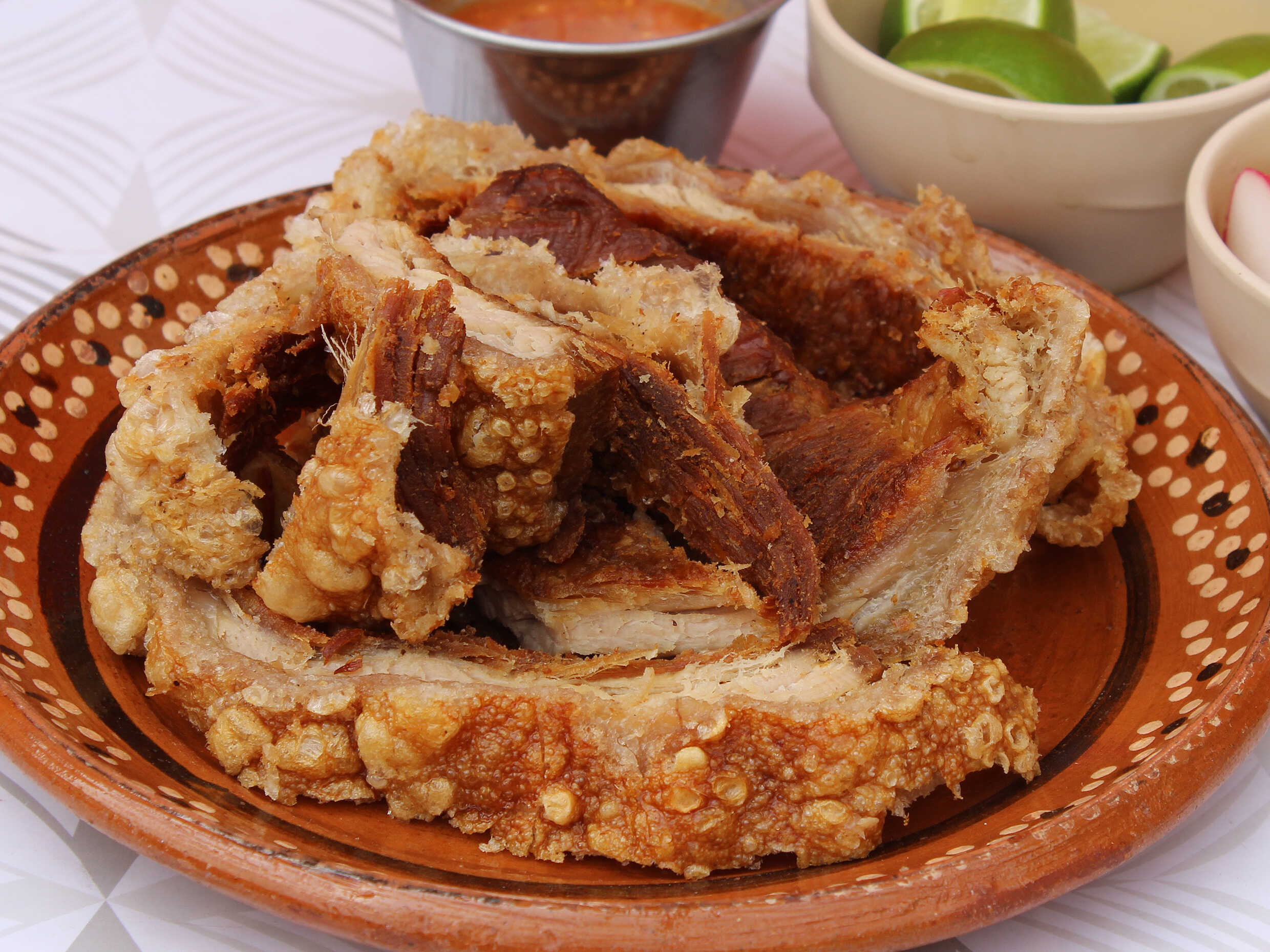 500 gr. de chicharrón, salsa verde y roja, rábanos y limones, tortillas.