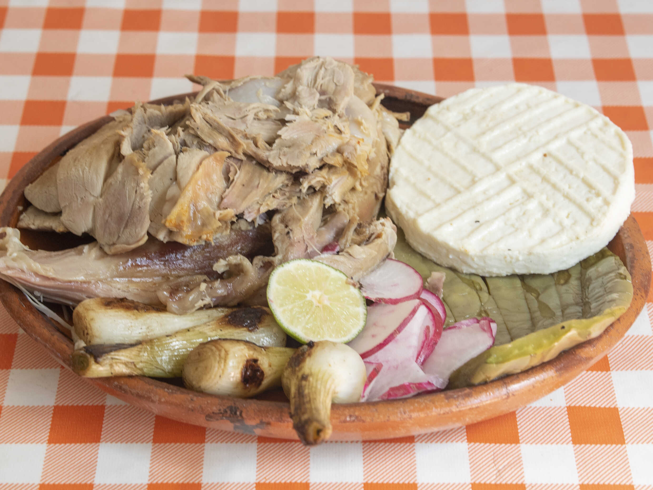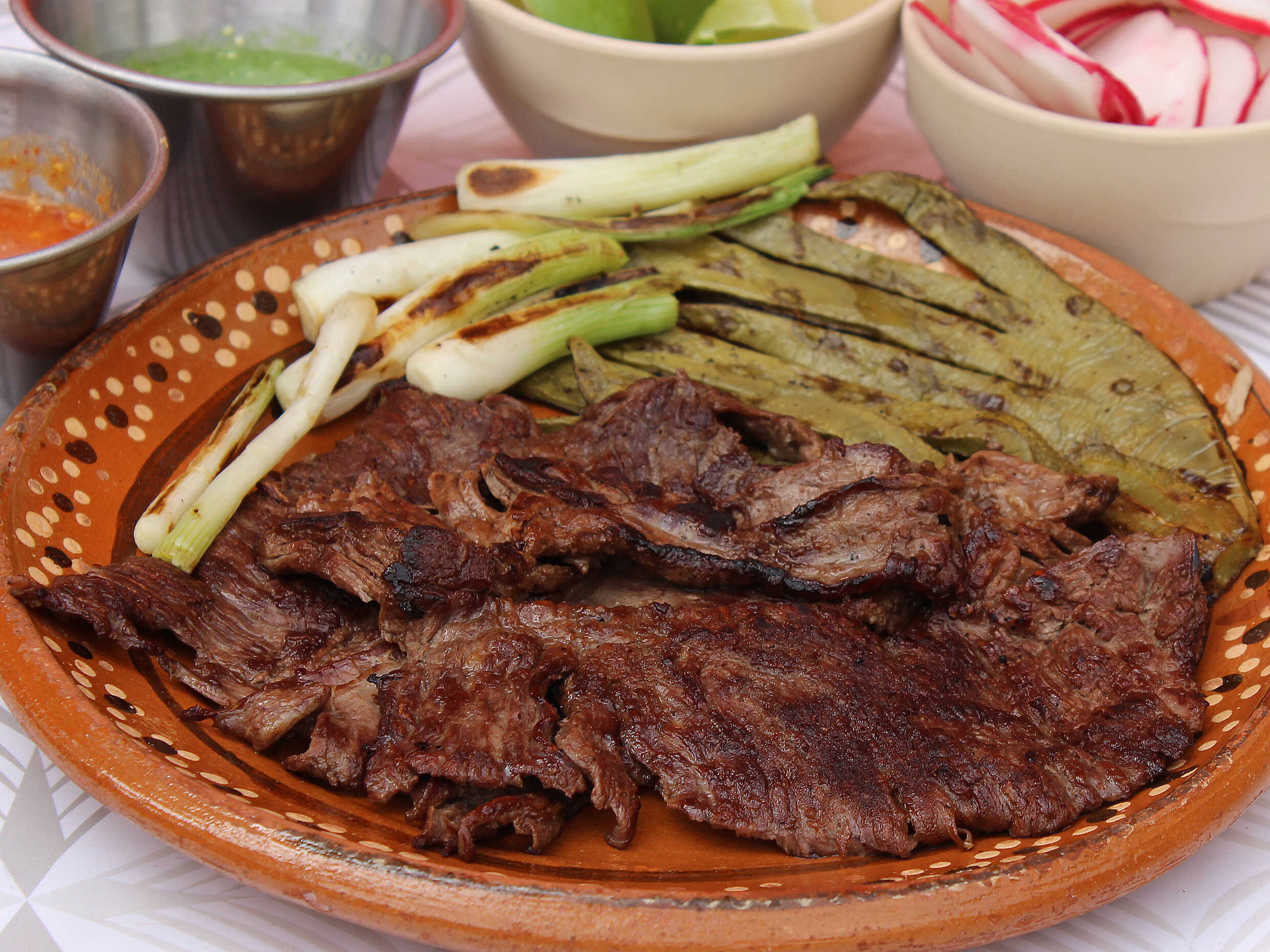 NOPALES Y CEBOLLITAS ASADAS, SALSA DE HABANERO, SALSA VERDE, RABANOS, LIMONES, 6 TORTILLAS, 1 CEMITAS PAN