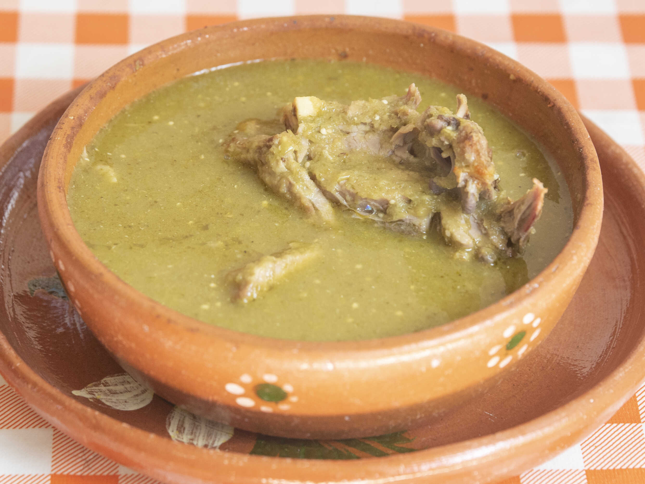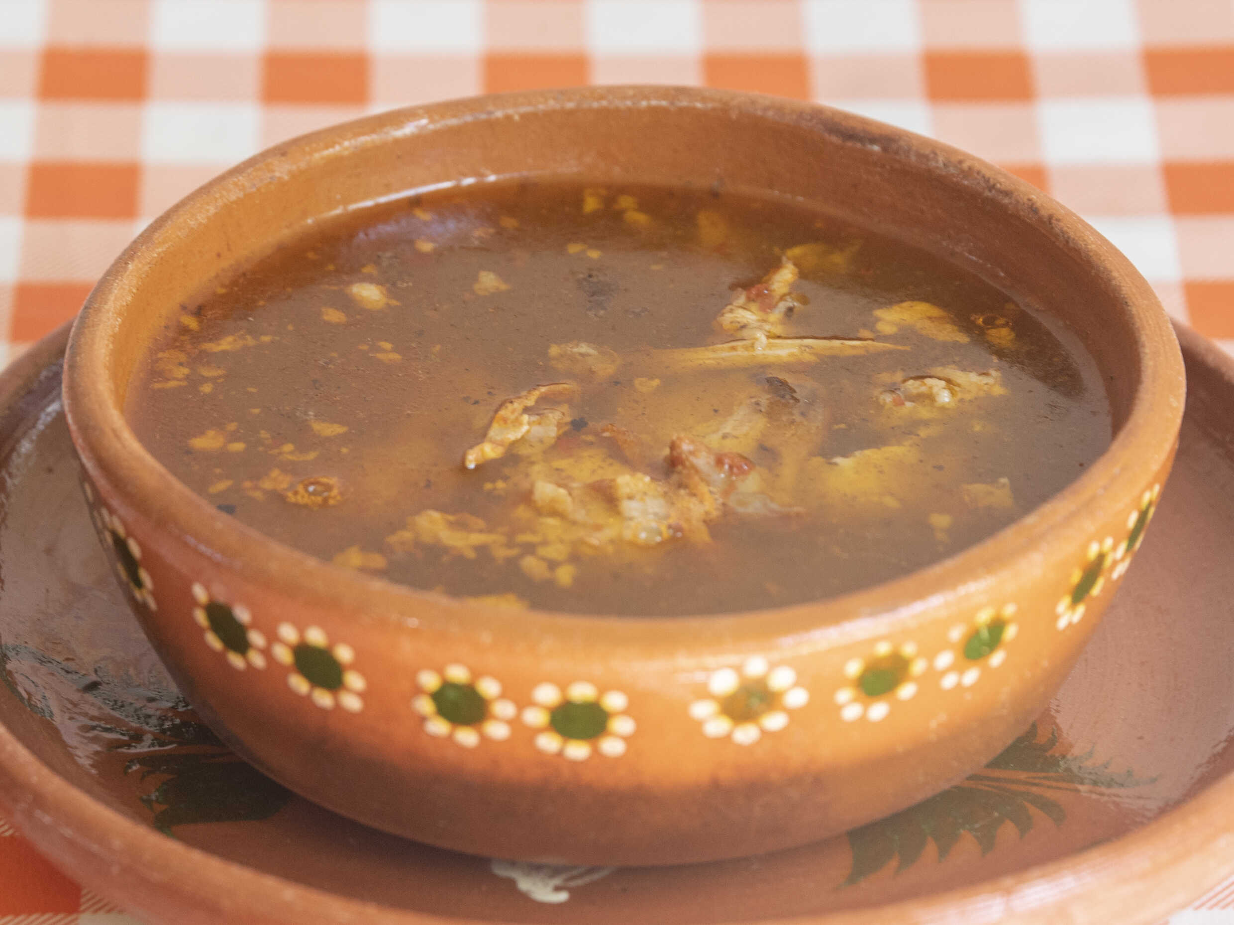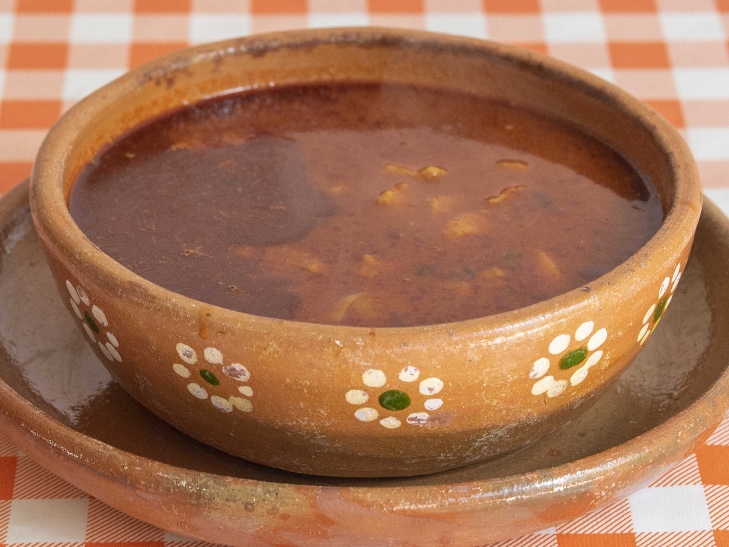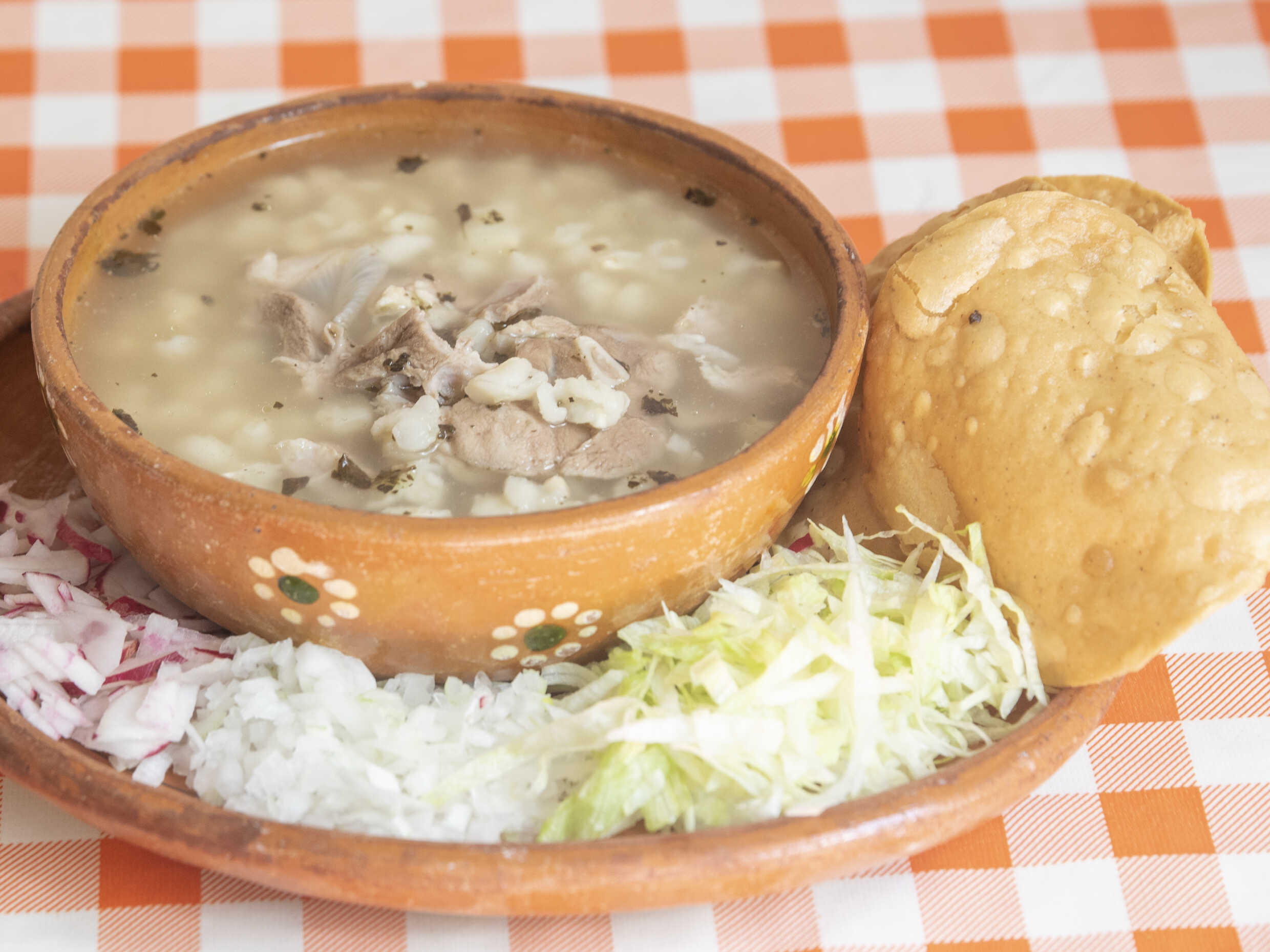 1 litro de pozole con molito rojo aparte, estilo Oaxaca, *50gr de chicharrón, *Tostadas, lechuga, rabanos, cebolla, limones.