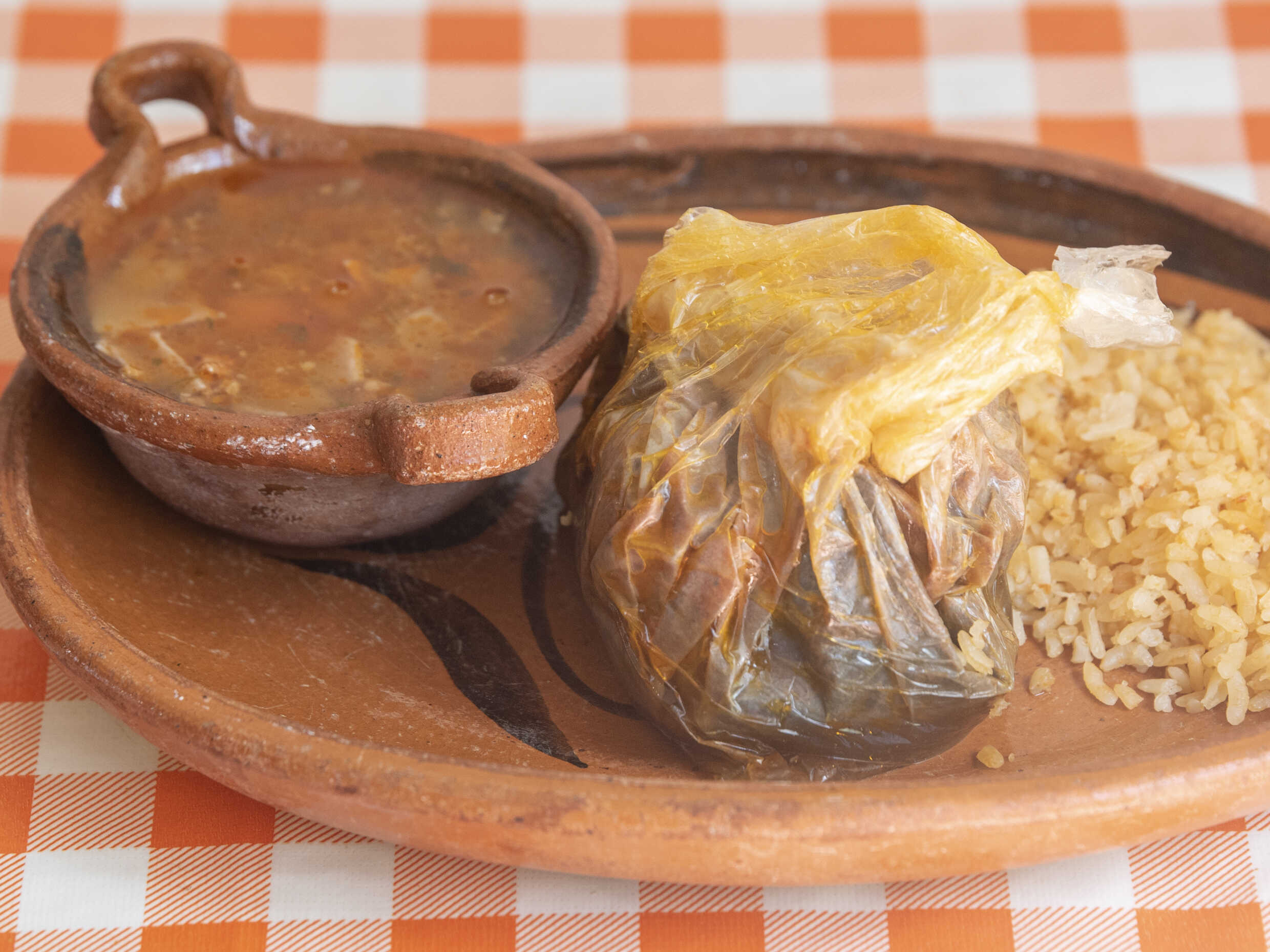 320gr. a 350 gr. de Mixiote de carnero, arroz, salsa verde y tortillas.
