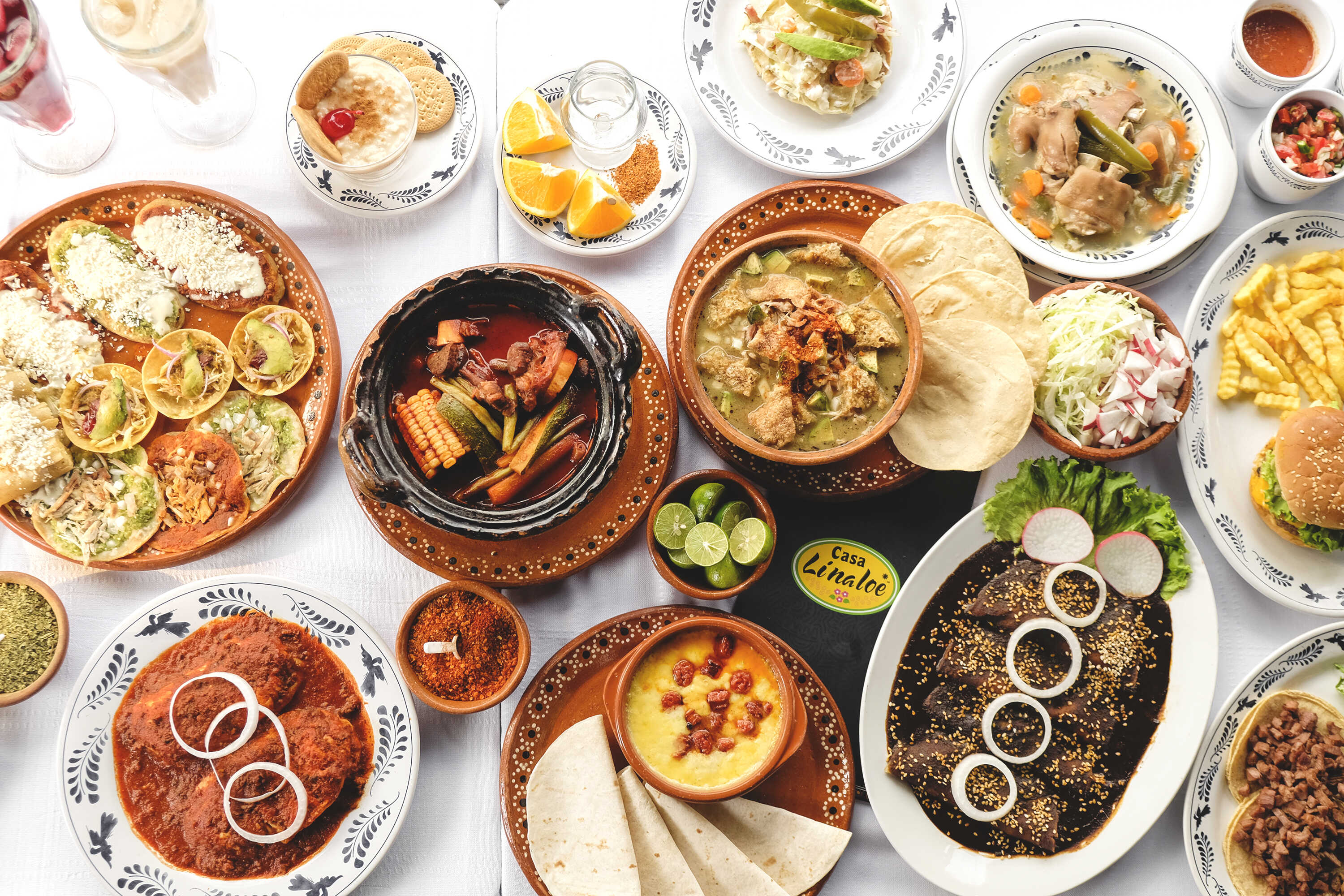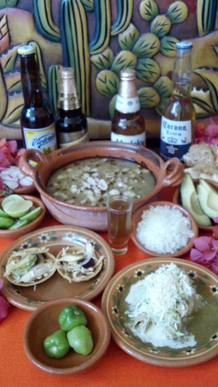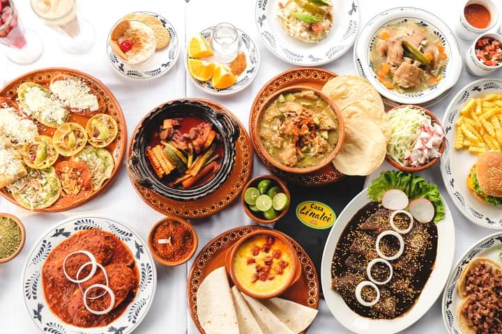 170 gr. de carne tampiqueña de res, 150 gr. de papas a la francesa, frijoles refritos, rajas poblanas, una enchilada de mole poblano o dos chalupas poblanas.