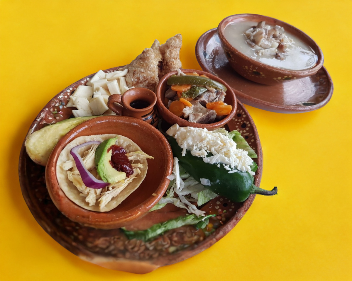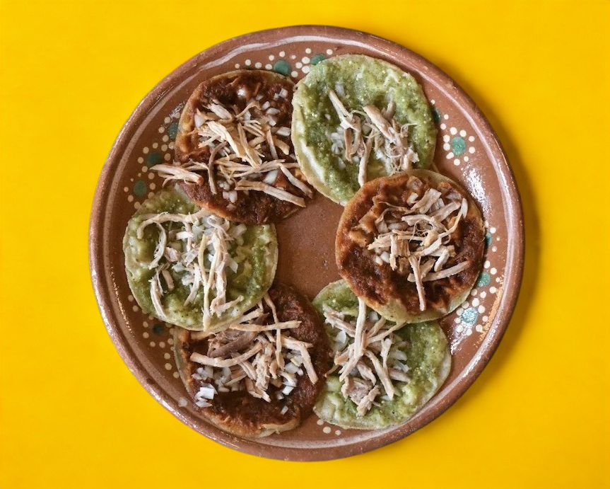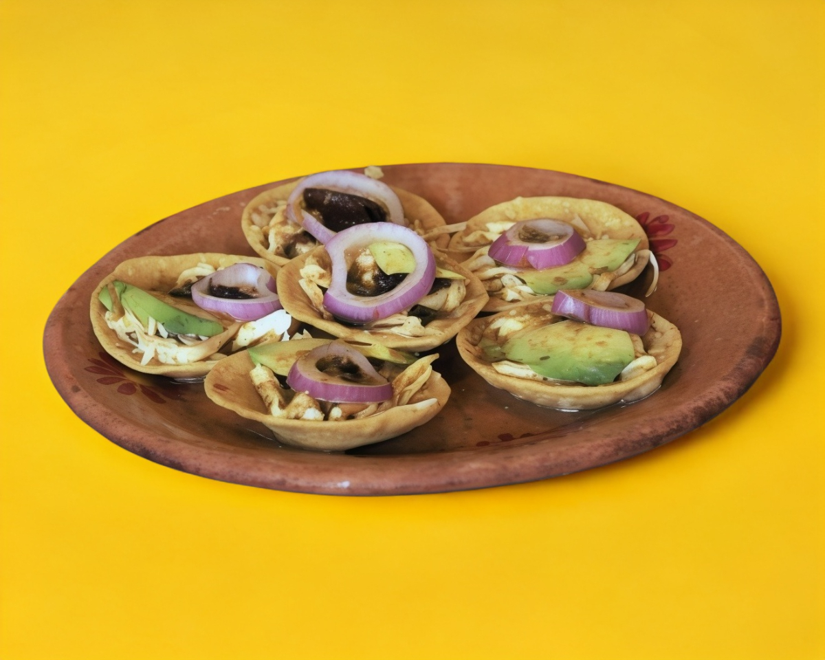 3 Piezas de chalupas poblanas, 3 piezas de chilapeñas, 3 piezas de tlacoyos y 4 piezas de mini taquitos dorados de pollo.