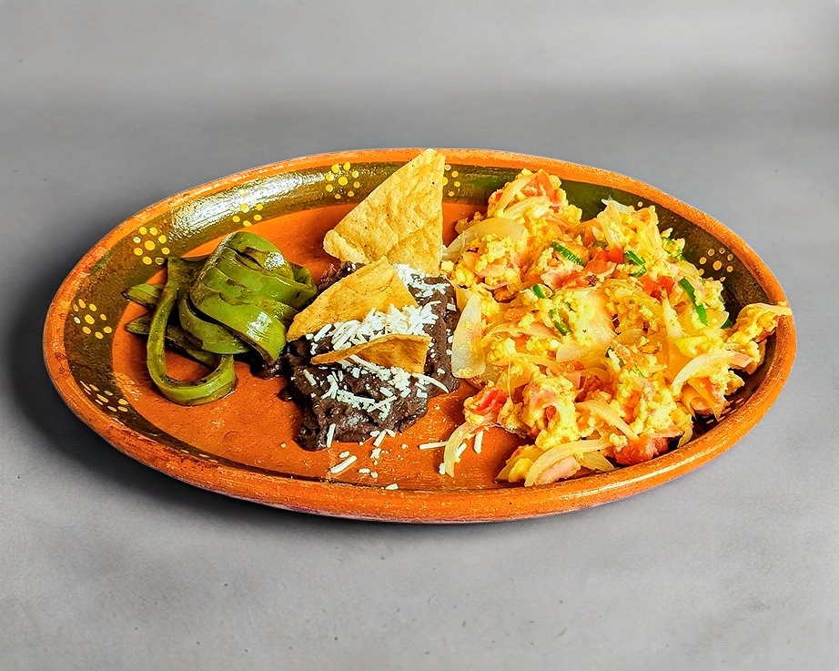 Huevo revuelto con jamón, jitomate, cebolla asada y chile serrano.