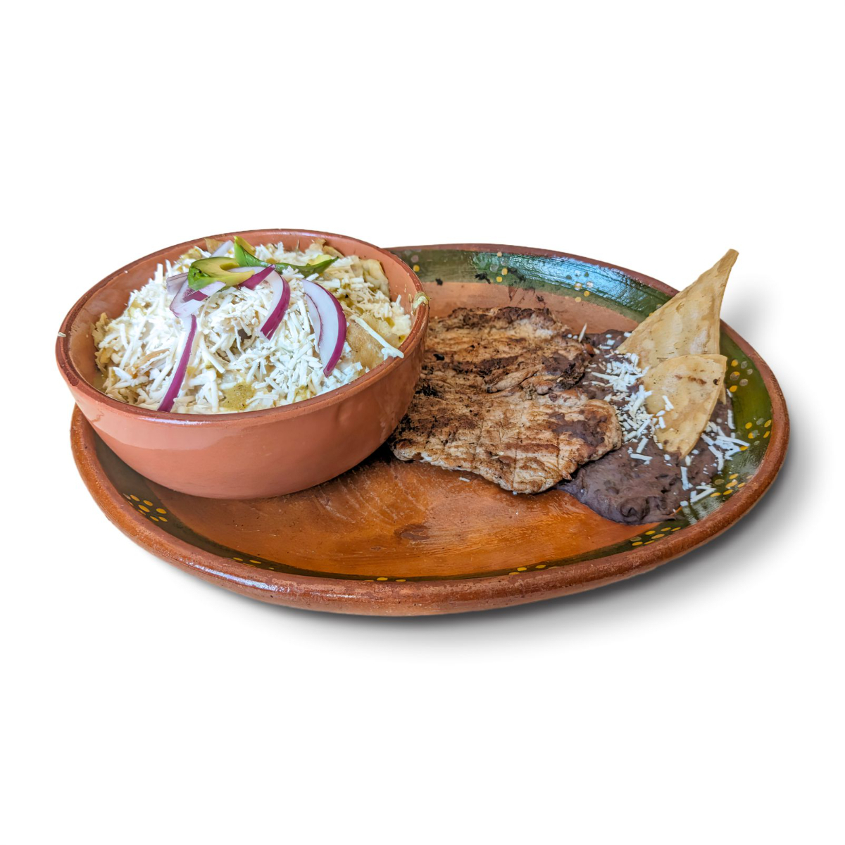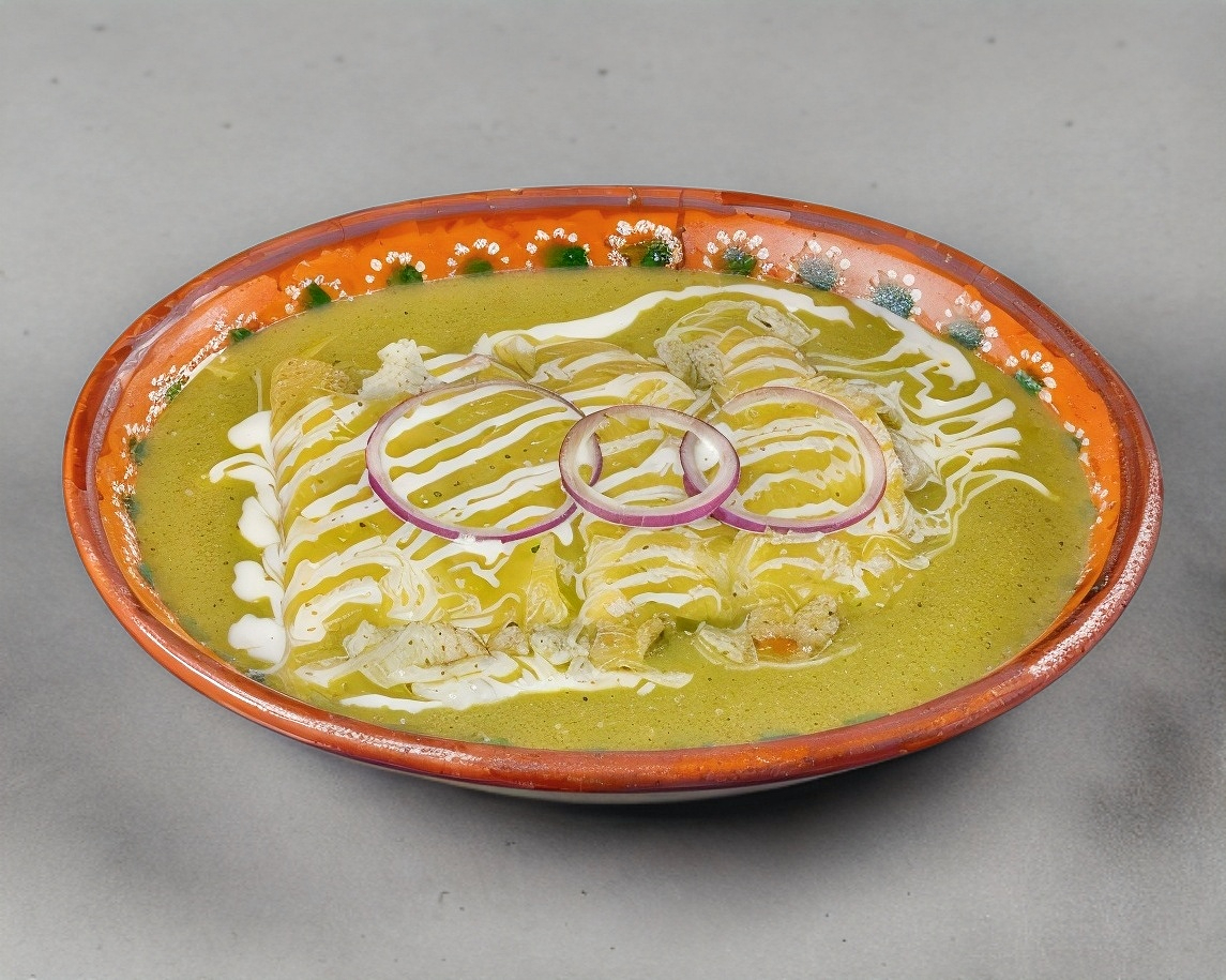 Tortilla crujiente bañada en salsa a elegir (verde o roja), Servido crema, queso fresco, aguacate y un cebolla morada. acompañado con frijoles