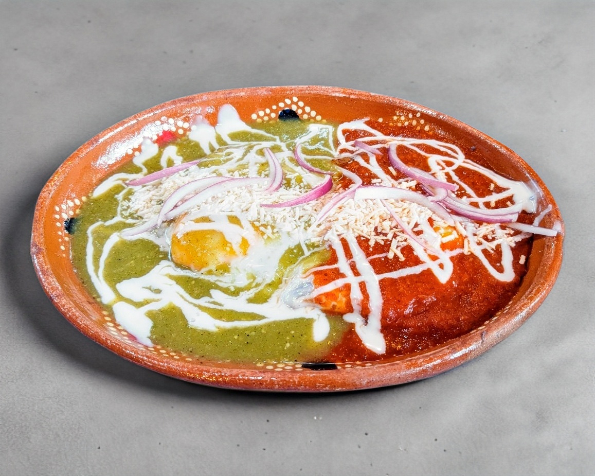 Huevos estrellados, colocados sobre dos tortillas fritas, separados con frijoles y bañados con salsa verde y roja, crema, cebolla morada y queso.