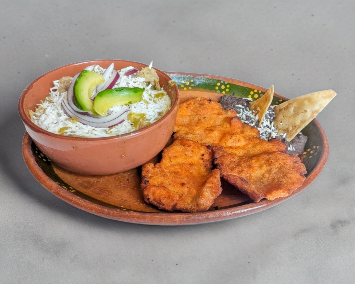 Tortilla crujiente bañada en salsa a elegir (verde o roja), Servido con Milanesa (120gr.), crema, queso fresco, aguacate y un cebolla morada. acompañado con frijoles
