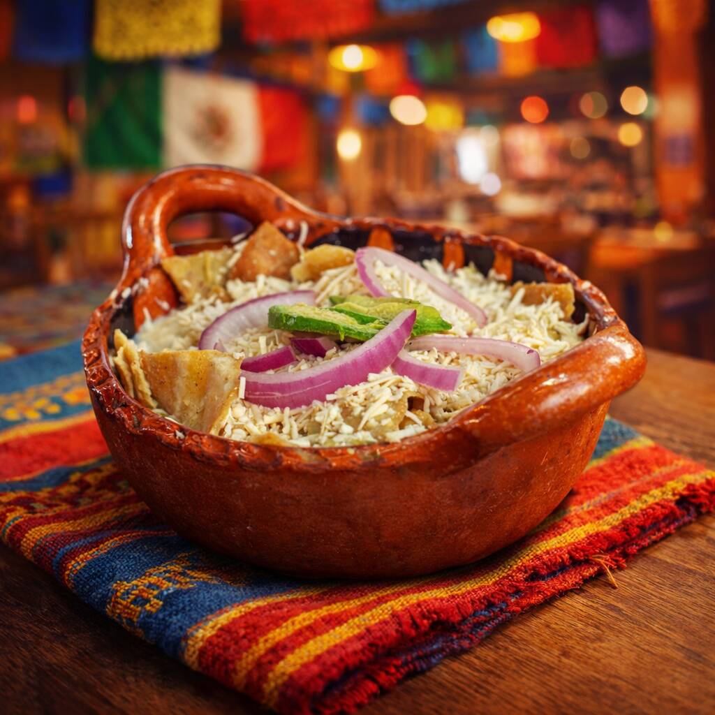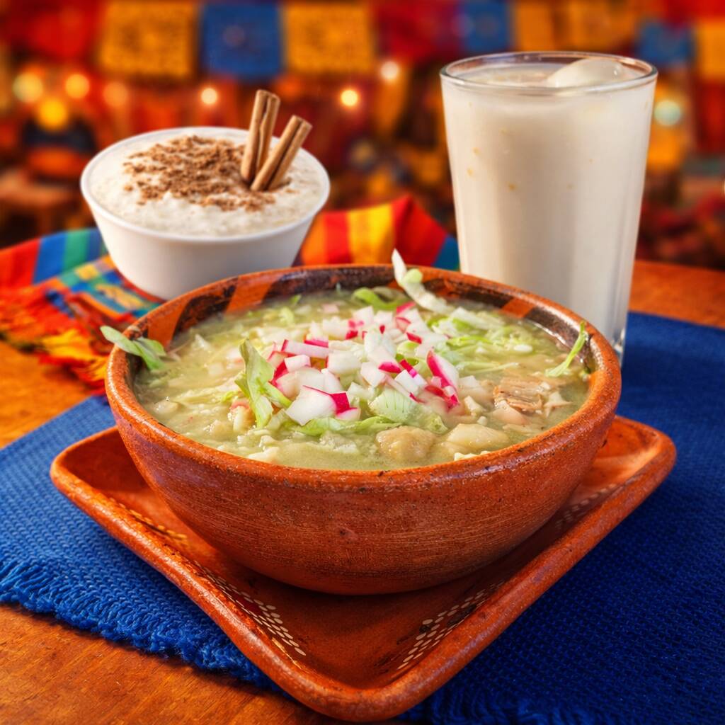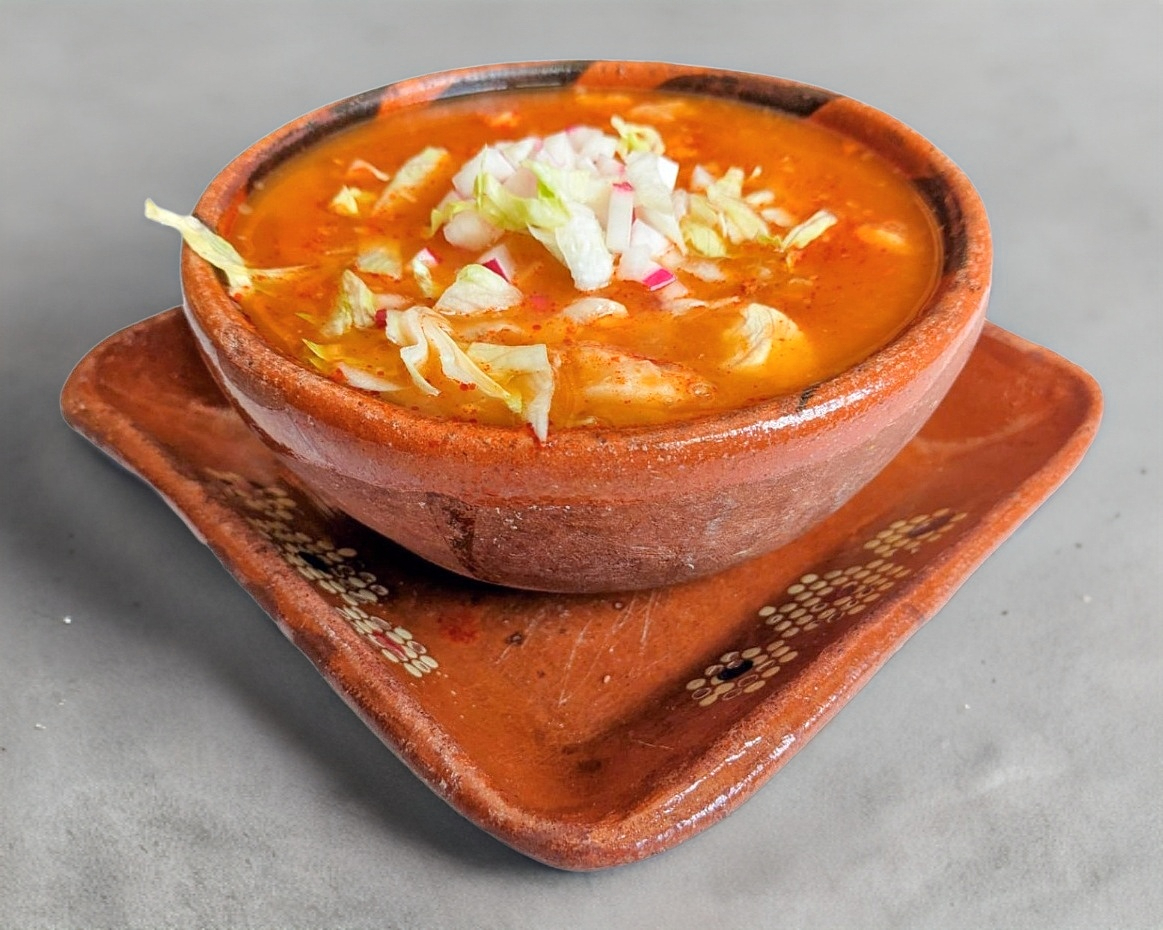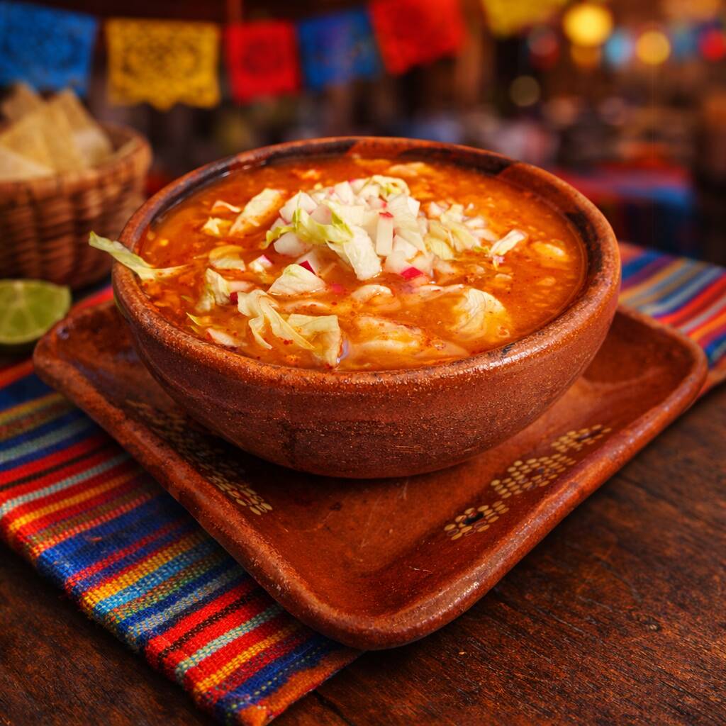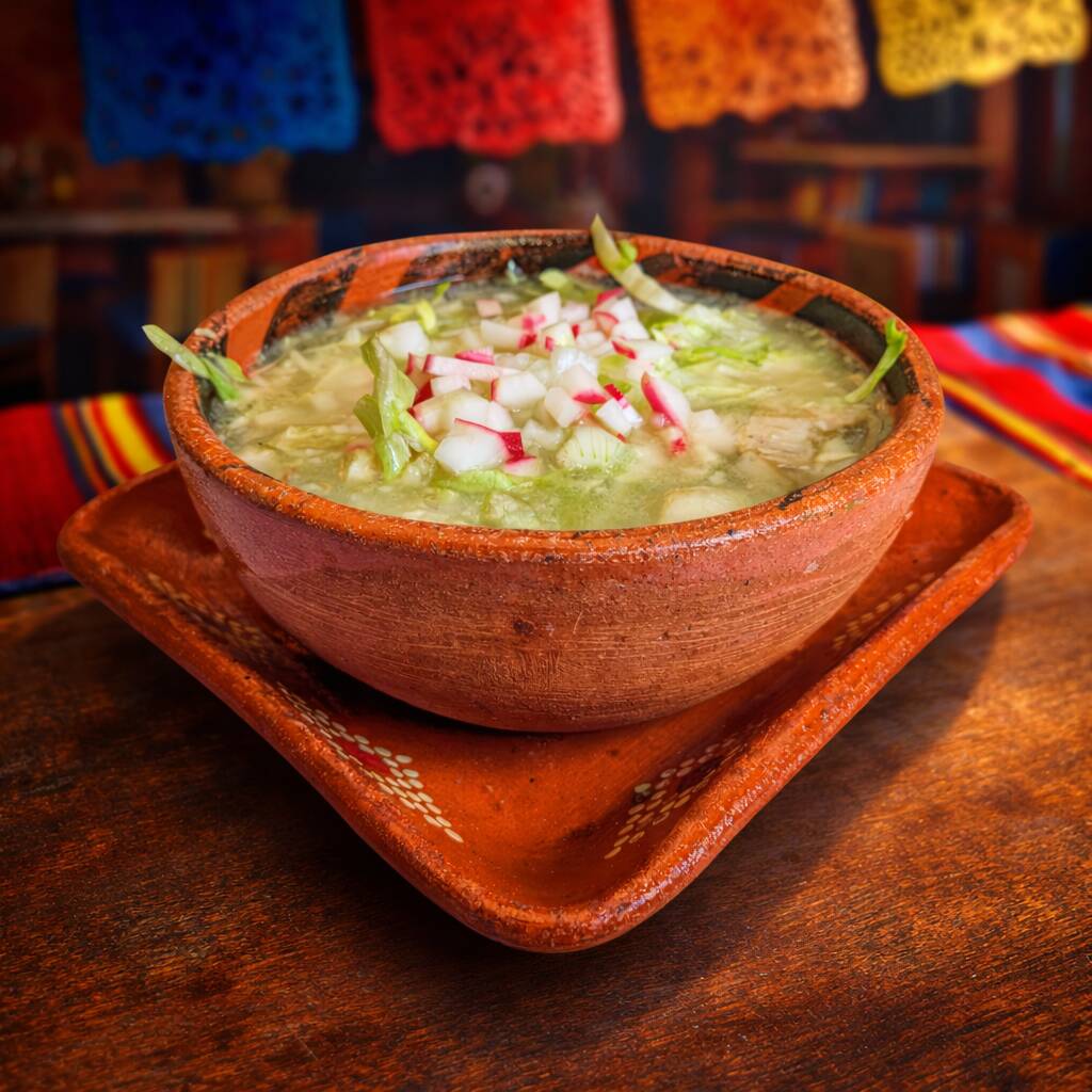 Pozole preparado con carne de cerdo o pollo, acompañado de crujientes tostadas, aguacate fresco, rabanos rebanados y cebolla picada.