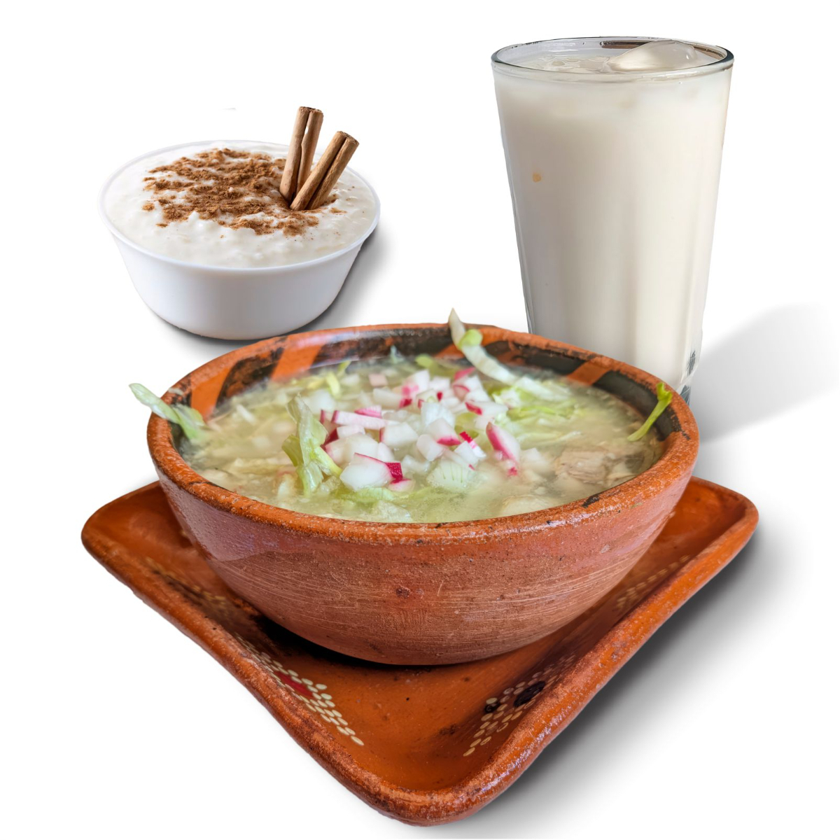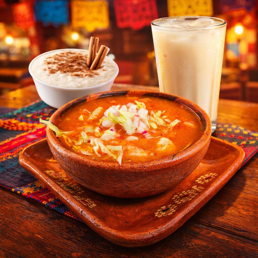 Pozole Rojo*1 + Agua de Horchata (500ml)*1 + Arroz con Leche*1