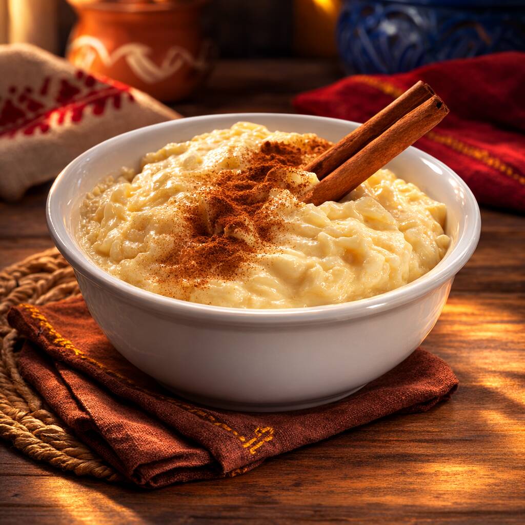 Un postre tradicional: arroz con leche suave, aromatizado con canela y endulzado a la perfección.