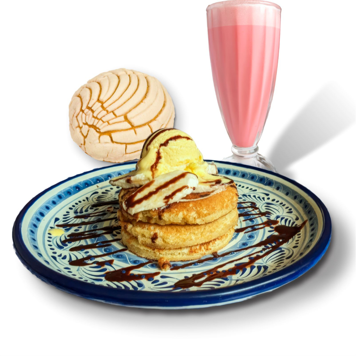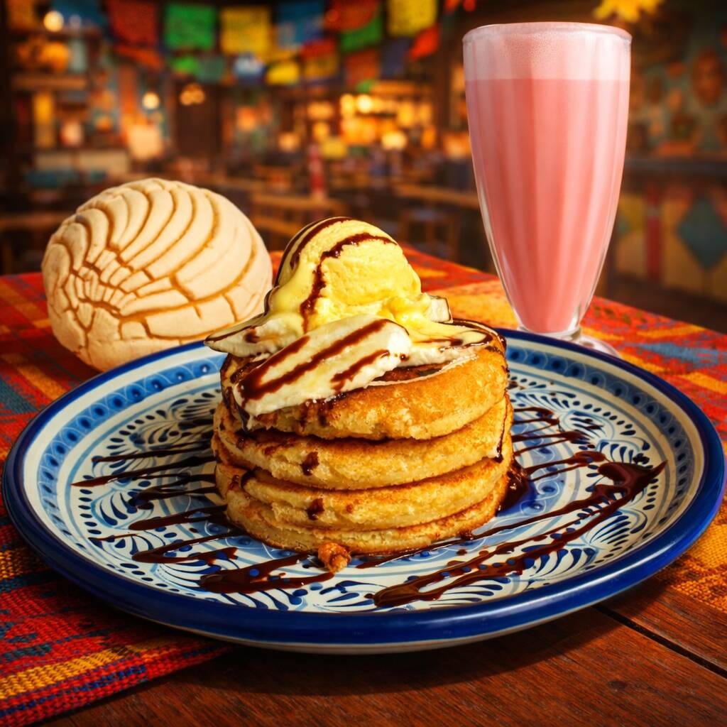 Hotcakes C/Helado*1 + Malteada de Fresa*1 + Pan Dulce*1