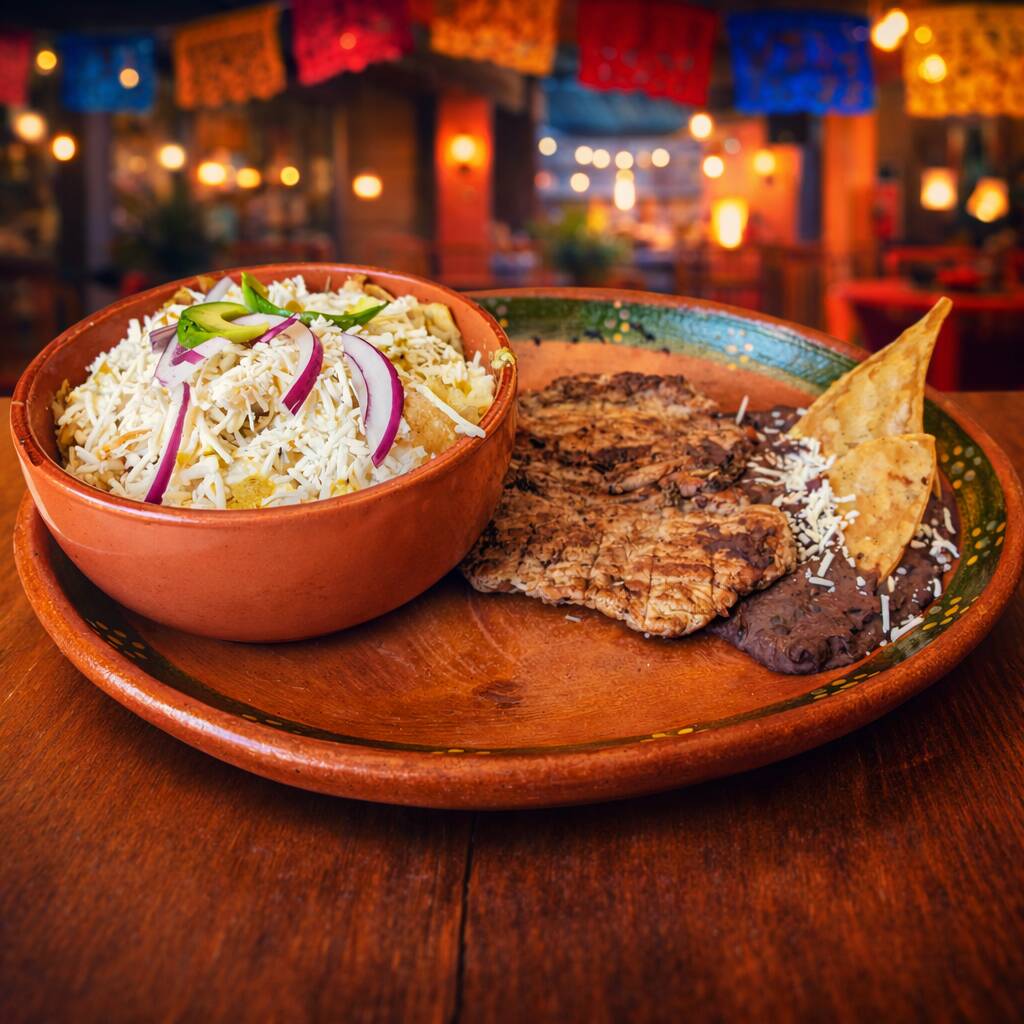 Tortilla crujiente bañada en salsa a elegir (verde o roja), Servido con Carne de Asada (100gr.), crema, queso fresco, aguacate y un cebolla morada. acompañado con frijoles